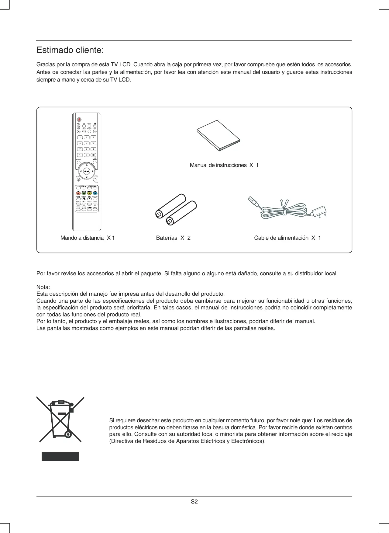 Mando a distancia X 1 Baterías X 2 Cable de alimentación X 1 Por favor revise los accesorios al abrir el paquete. Si falta alguno o alguno está dañado, consulte a su distribuidor local. Nota: Esta descripción del manejo fue impresa antes del desarrollo del producto. Cuando una parte de las especificaciones del producto deba cambiarse para mejorar su funcionabilidad u otras funciones, la especificación del producto será prioritaria. En tales casos, el manual de instrucciones podría no coincidir completamente con todas las funciones del producto real. Por lo tanto, el producto y el embalaje reales, así como los nombres e ilustraciones, podrían diferir del manual. Las pantallas mostradas como ejemplos en este manual podrían diferir de las pantallas reales. Si requiere desechar este producto en cualquier momento futuro, por favor note que: Los residuos de productos eléctricos no deben tirarse en la basura doméstica. Por favor recicle donde existan centros para ello. Consulte con su autoridad local o minorista para obtener información sobre el reciclaje (Directiva de Residuos de Aparatos Eléctricos y Electrónicos).