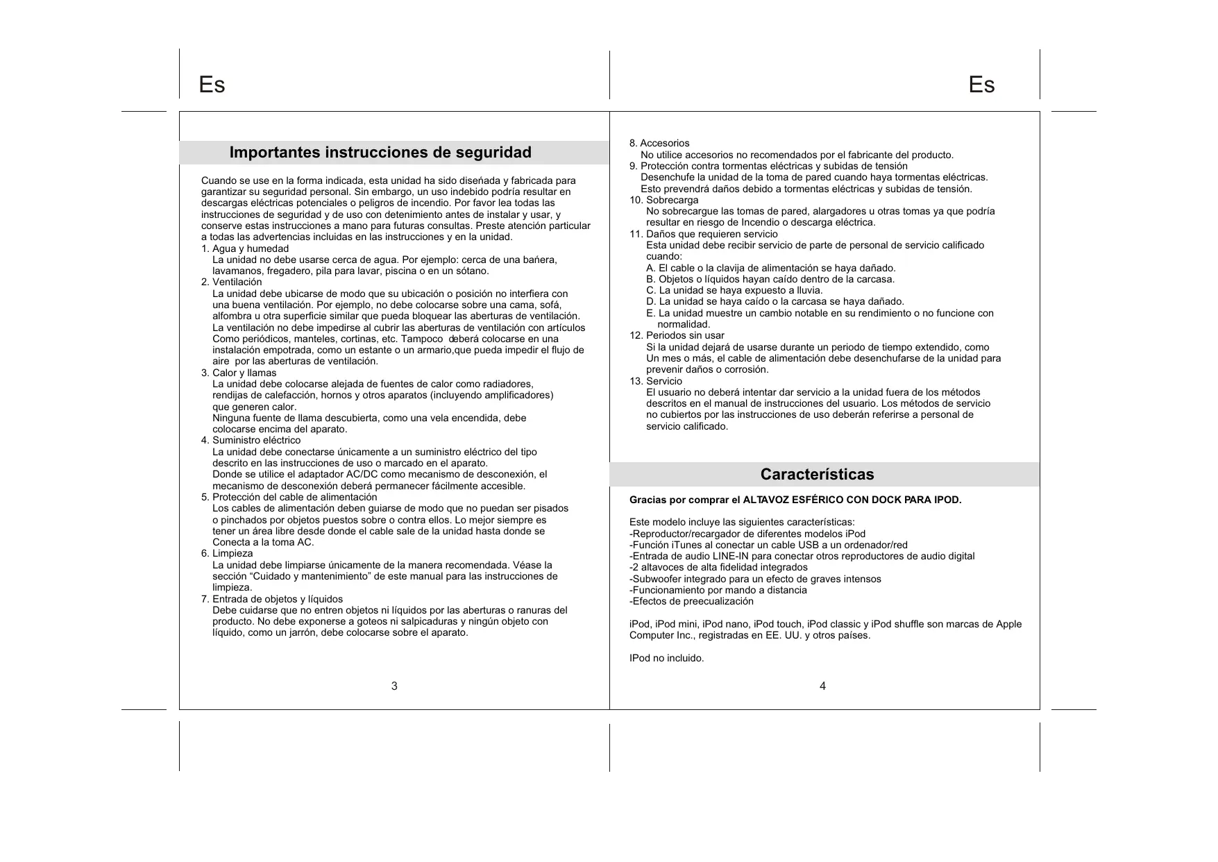 El usuario no deberá intentar dar servicio a la unidad fuera de los métodos descritos en el manual de instrucciones del usuario. Los métodos de servicio no cubiertos por las instrucciones de uso deberán referirse a personal de servicio calificado. Características Gracias por comprar el ALTAVOZ ESFÉRICO CON DOCK PARA IPOD. Este modelo incluye las siguientes características: -Reproductor/recargador de diferentes modelos iPod -Función iTunes al conectar un cable USB a un ordenador/red -Entrada de audio LINE-IN para conectar otros reproductores de audio digital -2 altavoces de alta fidelidad integrados -Subwoofer integrado para un efecto de graves intensos -Funcionamiento por mando a distancia -Efectos de preecualización iPod, iPod mini, iPod nano, iPod touch, iPod classic y iPod shuffle son marcas de Apple Computer Inc., registradas en EE. UU. y otros países. IPod no incluido.