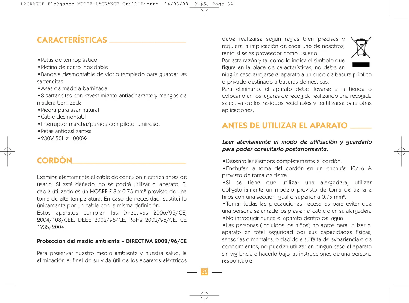 - Las personas (incluidos los niños) no aptos para utilizar el aparato en total seguridad por sus capacidades físicas, sensorias o mentales, o debido a su falta de experiencia o de conocimientos, no pueden utilizar en ningún caso el aparato sin vigilancia o hacerlo bajo las instrucciones de una persona responsable. Examine atentamente el cable de conexión eléctrica antes de usarlo. Si está dañado, no se podrá utilizar el aparato. El cable utilizado es un HO5RR-F 3 x 0.75 mm² provisto de una toma de alta temperatura. En caso de necesidad, sustituirlo únicamente por un cable con la misma definición. Estos aparatos cumplen las Directivas 2006/95/CE, 2004/108/CEE, DEEE 2002/96/CE, RoHs 2002/95/CE, CE 1935/2004. Protección del medio ambiente – DIRECTIVA 2002/96/CE Para preservar nuestro medio ambiente y nuestra salud, la eliminación al final de su vida útil de los aparatos eléctricos