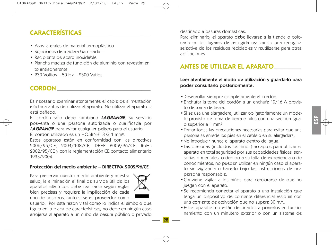 - Estos aparatos no están destinados a ponerlos en funcionamiento con un minutero exterior o con un sistema de Es necesario examinar atentamente el cable de alimentación eléctrica antes de utilizar el aparato. No utilizar el aparato si está dañado. El cordón sólo debe cambiarlo LAGRANGE, su servicio posventa o una persona autorizada o cualificada por LAGRANGE para evitar cualquier peligro para el usuario. El cordón utilizado es un HO5RN-F 3 G 1 mm². Estos aparatos están en conformidad con las directivas 2006/95/CE, 2004/108/CE, DEEE 2002/96/CE, RoHs 2002/95/CE y con la reglamentación CE contacto alimentario 1935/2004. Protección del medio ambiente – DIRECTIVA 2002/96/CE Para preservar nuestro medio ambiente y nuestra salud, la eliminación al final de su vida útil de los aparatos eléctricos debe realizarse según reglas bien precisas y requiere la implicación de cada uno de nosotros, tanto si se es proveedor como usuario. Por esta razón y tal como lo indica el símbolo que figura en la placa de características, no debe en ningún caso arrojarse el aparato a un cubo de basura público o privado