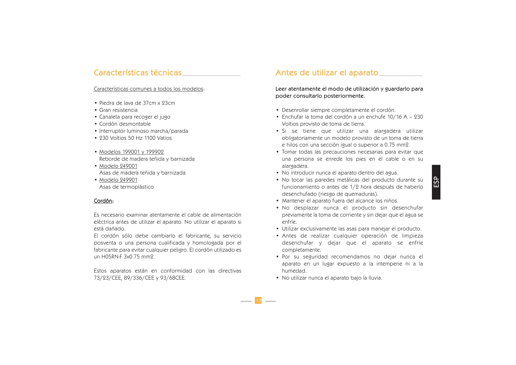 - Modelo 249901 Asas de termoplástico Cordón : Es necesario examinar atentamente el cable de alimentación eléctrica antes de utilizar el aparato. No utilizar el aparato si está dañado. El cordón sólo debe cambiarlo el fabricante, su servicio posventa o una persona cualificada y homologada por el fabricante para evitar cualquier peligro. El cordón utilizado es un H05RN-F 3x0.75 mm2. Estos aparatos están en conformidad con las directivas 73/23/CEE, 89/336/CEE y 93/68CEE.