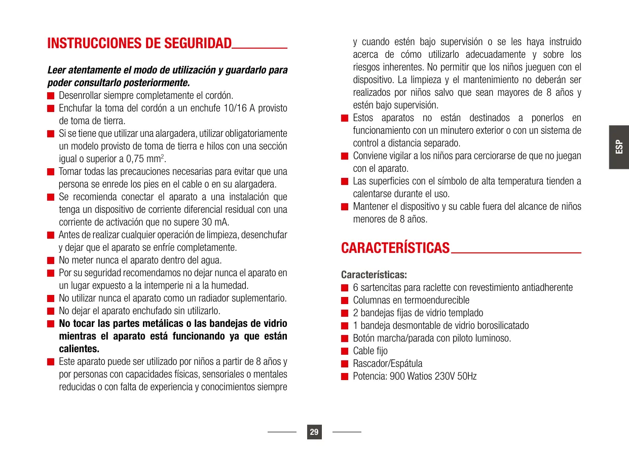 y cuando estén bajo supervisión o se les haya instruido acerca de cómo utilizarlo adecuadamente y sobre los riesgos inherentes. No permitir que los niños jueguen con el dispositivo. La limpieza y el mantenimiento no deberán ser realizados por niños salvo que sean mayores de 8 años y estén bajo supervisión. Estos aparatos no están destinados a ponerlos en funcionamiento con un minutero exterior o con un sistema de control a distancia separado. Conviene vigilar a los niños para cerciorarse de que no juegan con el aparato. Las superficies con el símbolo de alta temperatura tienden a calentarse durante el uso. Mantener el dispositivo y su cable fuera del alcance de niños menores de 8 años. Características Características: 6 sartencitas para raclette con revestimiento antiadherente Columnas en termoendurecible 2 bandejas fijas de vidrio templado 1 bandeja desmontable de vidrio borosilicatado Botón marcha/parada con piloto luminoso. Cable fijo Rascador/Espátula Potencia: 900 Watios 230V 50Hz