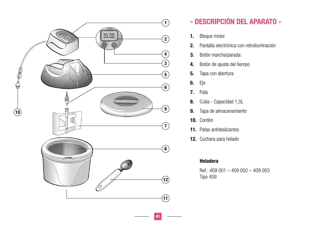 adaptados a su aparato. En caso de fuga del líquido de la cuba, no volver a utilizar el aparato y póngase en contacto con el servicio posventa de . El líquido no es tóxico. No introducir la cuba del aparato en el lavavajillas, en el horno o en el microondas. No llenarlo con un líquido a más 40°C. Evitar cualquier contacto con las partes en movimiento de la heladera. Alejar manos, cabello, prendas de vestir, espátulas y otros utensilios durante el funcionamiento para reducir los riesgos de heridas y/o daños en el aparato. No hacer que el aparato funcione en un congelador o en un frigorífico. Es necesario examinar atentamente el cable de alimentación antes de cualquier utilización. Si éste está dañado, no hay que utilizar el aparato. El cordón sólo debe cambiarlo su servicio posventa o una persona cualificada y autorizada por para evitar cualquier peligro para el usuario. El cordón utilizado es un HO5VV-F 3 G 0,75mm². Estos aparatos se ajustan a las directivas 2006/95/CE, 2004/108/ CE, DEEE 2002/96/CE, RoHs 2002/95/CE y a la normativa CE relativa al contacto alimentario 1935/2004. MEDIO AMBIENTE CARACTERÍSTICAS Protección del medio ambiente- DIRECTIVA 2002/96/CE Para preservar nuestro medio ambiente y nuestra salud, la eliminación al final de su vida útil de los aparatos eléctricos debe realizarse según reglas precisas y requiere la implicación de cada uno de nosotros, tanto si se es proveedor como usuario. Por esta razón y tal como lo indica el símbolo que figura en la placa de características, en ningún caso debe arrojarse el aparato a un cubo de basura público o privado destinado a basuras domésticas. Durante su eliminación, es responsabilidad suya depositar el aparato en un centro de recogida pública designado para el reciclaje de equipos eléctricos o electrónicos. Para obtener más información sobre ■ Bloque motor ■ Pantalla electrónica con retroiluminación y visualización del tiempo restante de preparación Tapa de AS con abertura Cuba de polipropileno con interior de aluminio - Capacidad 1,5L Tapa de almacenamiento de AS Cuchara para hielo de acero inoxidable con mango de polipropileno ■ 230 Voltios - 50Hz – 140 vatios