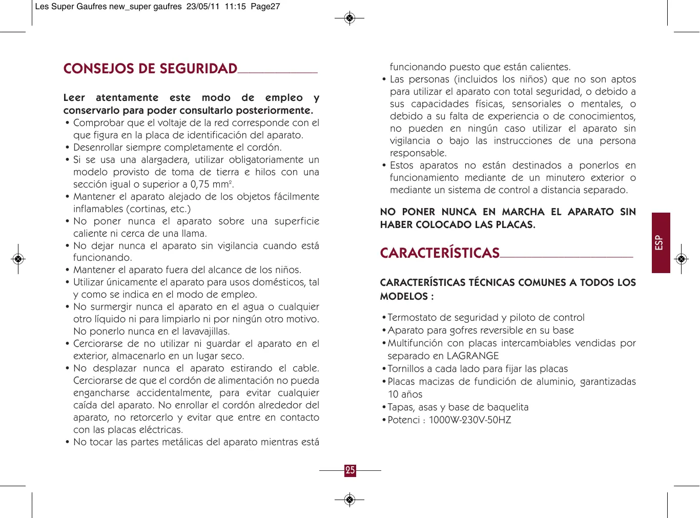 ESP NO PONER NUNCA EN MARCHA EL APARATO SIN HABER COLOCADO LAS PLACAS. únicamente por un cable con la misma definición. Estos aparatos cumplen las Directivas 2006/95/CE, 2004/108/CE, DEEE 2002/96/CE, RoHs 2002/95/CE, CE 1935/2004. Modelos Super 2 Gaufres REF 039 111 Se suministra con un juego de placas de 2 gofres de 155 x 100 mm Modelo Super 2 Gaufres + Gaufrettes REF 039 211 Se suministra con un juego de placas de 2 gofres de 155 x 100 mm y un juego de placas de 4 gaufrettes de 120 x 95 mm Modelo Super 2 Gaufres + Croq’ REF 039 411 Se suministra con un juego de placas de 2 gofres de 155 x 100 mm y un juego de placas de 4 sándwiches de 120 x 95 mm Modelo Super 2 Gaufres Corazón REF 039 511 Se suministra con un juego de placas de 6 gofres corazón Modelo Super 2 Gaufres + Gaufrettes + Croq’ REF 039 611 Se suministra con un juego de placas de 2 gofres de 155 x 100 mm, un juego de placas de 4 Gaufrettes de 120 x 95 mm y un juego de placas de 4 sándwiches de 120 x 95 mm. MEDIO AMBIENTE____________________________ Protección del medio ambiente – DIRECTIVA 2002/96/CE Para preservar nuestro medio ambiente y nuestra salud, la eliminación al final de su vida útil de los aparatos eléctricos debe realizarse según reglas bien precisas y requiere la implicación de cada uno de nosotros, tanto si se es proveedor como usuario. Por esta razón y tal como lo indica el símbolo que figura en la placa de características, no debe en ningún caso arrojarse el aparato a un cubo de basura público o privado destinado a basuras domésticas. Para eliminarlo, el aparato debe llevarse a la tienda o colocarlo en los lugares de recogida realizando una recogida selectiva de los residuos reciclables y reutilizarse para otras aplicaciones. Juegos de placas vendidos por separado: