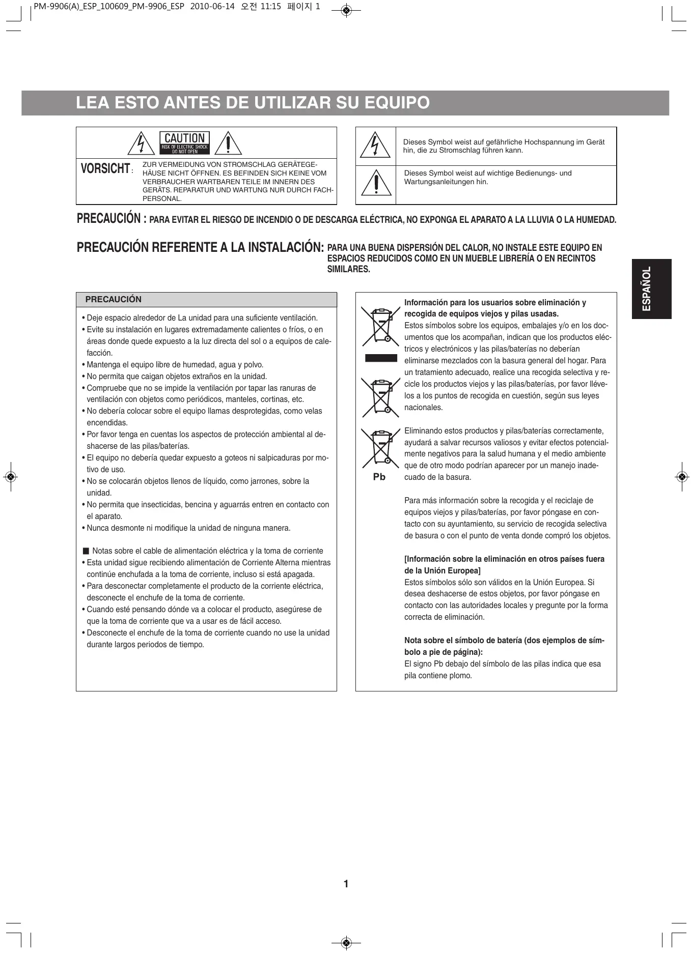 PRECAUCIÓN : PARA EVITAR EL RIESGO DE INCENDIO O DE DESCARGA ELÉCTRICA, NO EXPONGA EL APARATO A LA LLUVIA O LA HUMEDAD. ESPACIOS REDUCIDOS COMO EN UN MUEBLE LIBRERÍA O EN RECINTOS SIMILARES. PRECAUCIÓN Información para los usuarios sobre eliminación y recogida de equipos viejos y pilas usadas. Estos símbolos sobre los equipos, embalajes y/o en los documentos que los acompañan, indican que los productos eléctricos y electrónicos y las pilas/baterías no deberían eliminarse mezclados con la basura general del hogar. Para un tratamiento adecuado, realice una recogida selectiva y recicle los productos viejos y las pilas/baterías, por favor llévelos a los puntos de recogida en cuestión, según sus leyes nacionales.