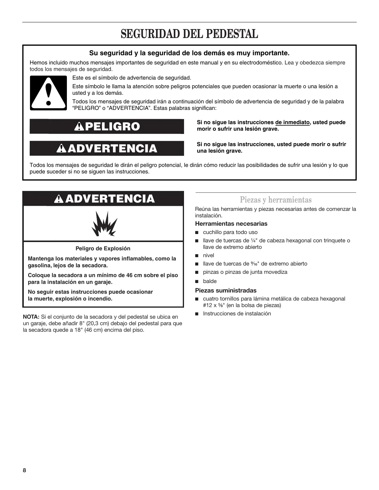 NOTA: Si el Conjunto de la secadora y del pedestal se ubica en un garaje, debenañadir 8'' (20,3 cm) bajo del pedestal para que la secadora quede a 18'' (46 cm) encima del piso.
