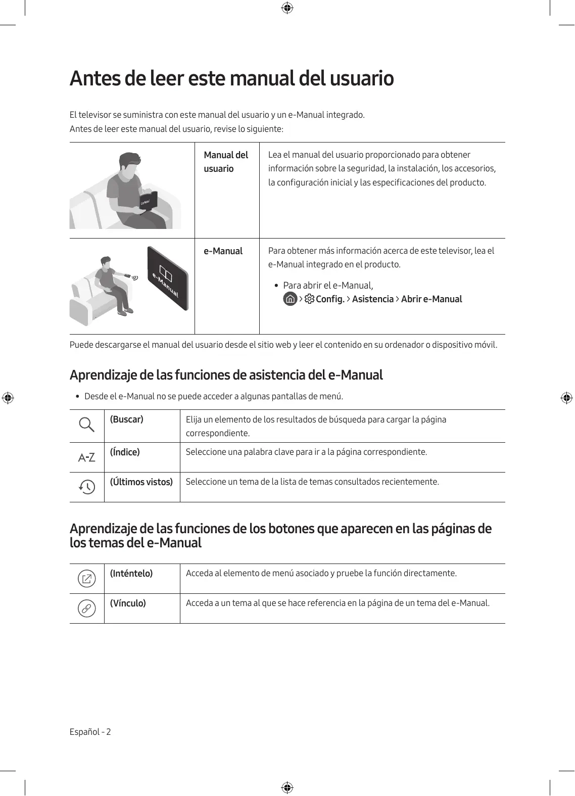 - • Para abrir el e-Manual, > Config. > Asistencia > Abrir e-Manual Puede descargarse el manual del usuario desde el sitio web y leer el contenido en su ordenador o dispositivo móvil. Aprendizaje de las funciones de asistencia del e-Manual
