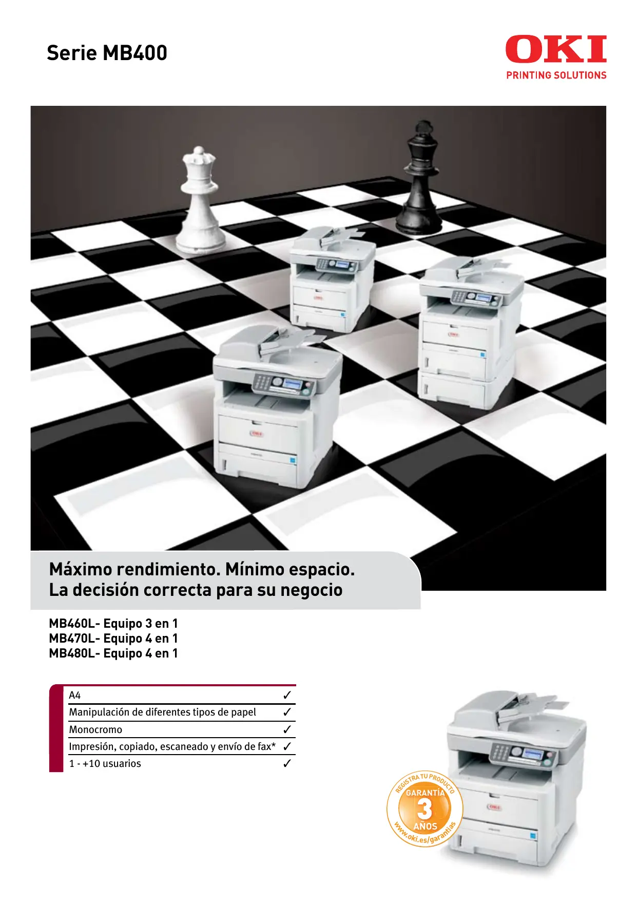 - No disponible en MB460L. Velocidad del fax* Memoria de página del fax* Estándar: 64 MB; Máx: 320 MB Dúplex Estándar 2ª bandeja Opcional (530 hojas) Cartuchos de tóner 3.500; 7.000 páginas (MB460L, MB470L) 3.500; 7.000; 12.000 páginas (MB480L) Máxima fiabilidad Eficacia mejorada Con la Serie MB400 podrá La Serie MB400 incluye un tranquilidad absoluta. Cada uno de para trabajar en red, mejora la comenzar a trabajar en el momento conjunto de utilidades de software los modelos cuenta con un diseño productividad de todo el equipo de su entrega, lo que permite a destinadas a obtener aún más realmente resistente que incorpora con un rendimiento líder en su todo el personal de su oficina rendimiento de estos equipos la tecnología digital LED de alta categoría a un precio asequible. continuar con sus tareas de multifunción. fiabilidad de OKI. Al no disponer Su rápida velocidad de impresión impresión, copiado, escaneado y de piezas móviles, no hay desgaste y copiado, la impresión a doble y las averías son prácticamente cara y la posibilidad de ampliar la necesiten. inexistentes. Estamos tan capacidad de papel, respaldada convencidos de la máxima calidad con consumibles de alta capacidad, de nuestros productos que proporcionan una eficacia continua a ofrecemos de forma gratuita una cualquier oficina o grupo de trabajo ampliación del período de garantía de tamaño reducido. estándar hasta los 3 años.