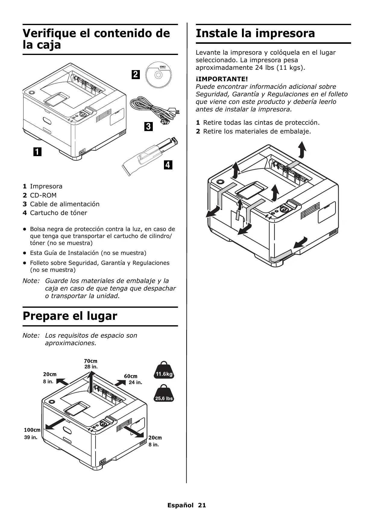 Verifique el contenido de la caja . Prepare el lugar . . . . . . . . . . . . . Instale la impresora . . . . . . . . . . Preparar el Cartucho de cilindro de imagen . . . . . . . . . . . . . . . . Instalar cartucho de tóner. . . . . . Cargar papel . . . . . . . . . . . . . . . Conectar el cable de alimentación Conexión a la computadora. . . . . Procedimientos de Windows . . . . Procedimientos de Macintosh . . . Assistencia Técnica y Soporte . . . Verifique el contenido de la caja Instale la impresora Levante la impresora y colóquela en el lugar seleccionado. La impresora pesa aproximadamente 24 lbs (11 kgs). ¡IMPORTANTE! Puede encontrar información adicional sobre Seguridad, Garantía y Regulaciones en el folleto que viene con este producto y debería leerlo antes de instalar la impresora. 1 Retire todas las cintas de protección. 2 Retire los materiales de embalaje.