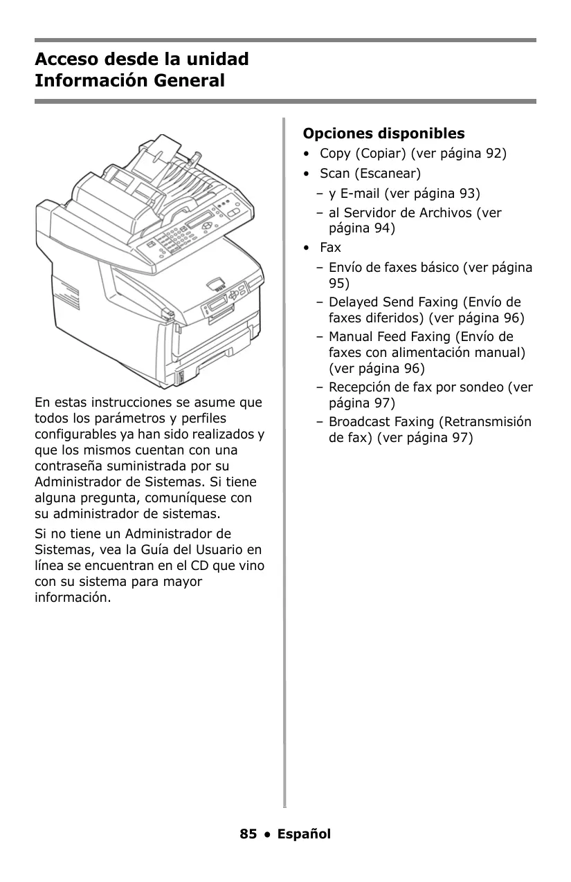 - Manual Feed Faxing (Envío de faxes con alimentación manual) (ver págrina 96)