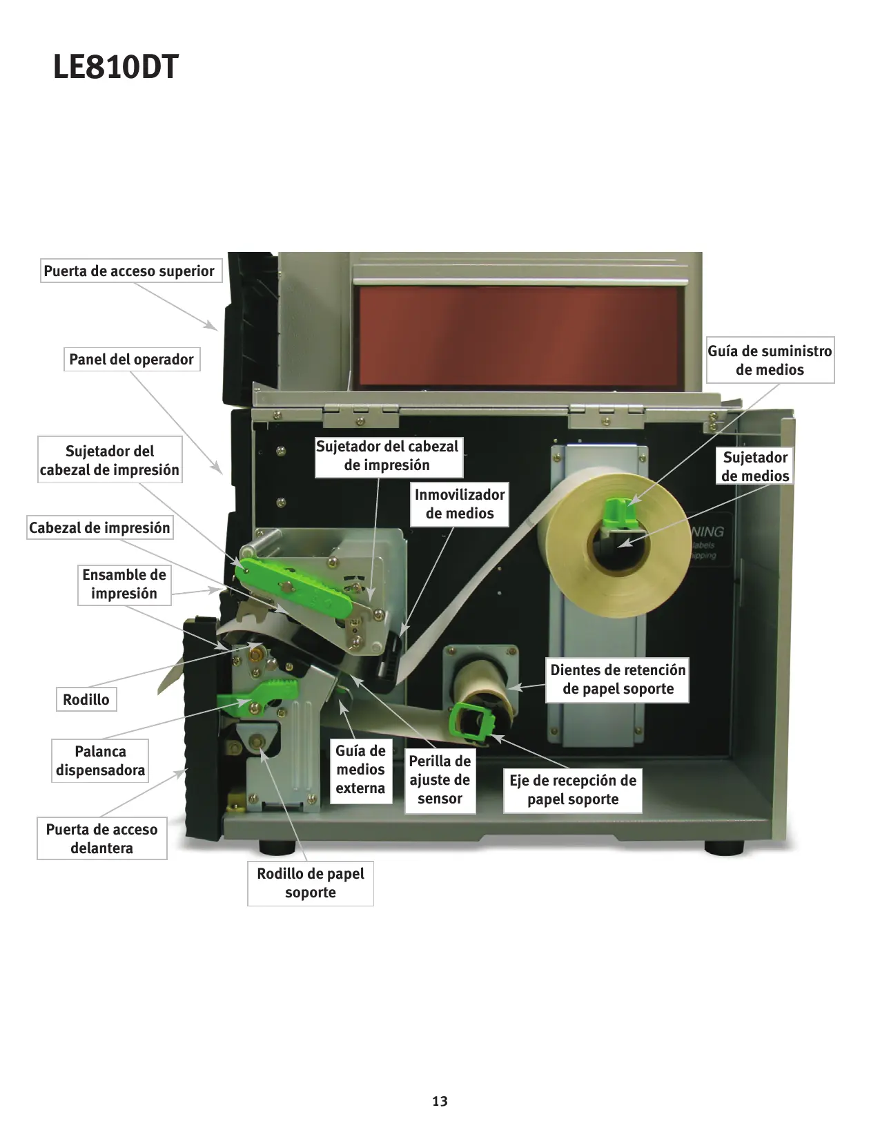 - Coloque el medio debajo del Inmovilizador de medios, a工程技术 del Ensamble de sensor de medios y por debajo del Cabezal de impresión hasta que salga por la parte delantera del mecanismo de impresión. Empujé el medio al fondo de la impressora. El acceso libre al trayecto de etiquetas se logra empujando la parte superior de la Guía de medios externa hacía abajo.