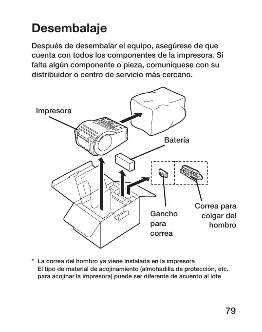 Desembalaje Después de desembalar el equipo, asegürese de que cuenta con todos los componentes de la impresora. Si falta algün componente o pieza, comuniquese con su distribuidor o centro de servicio mâs cercano. Impresora Correa para Gancho colgar del para hombro correa