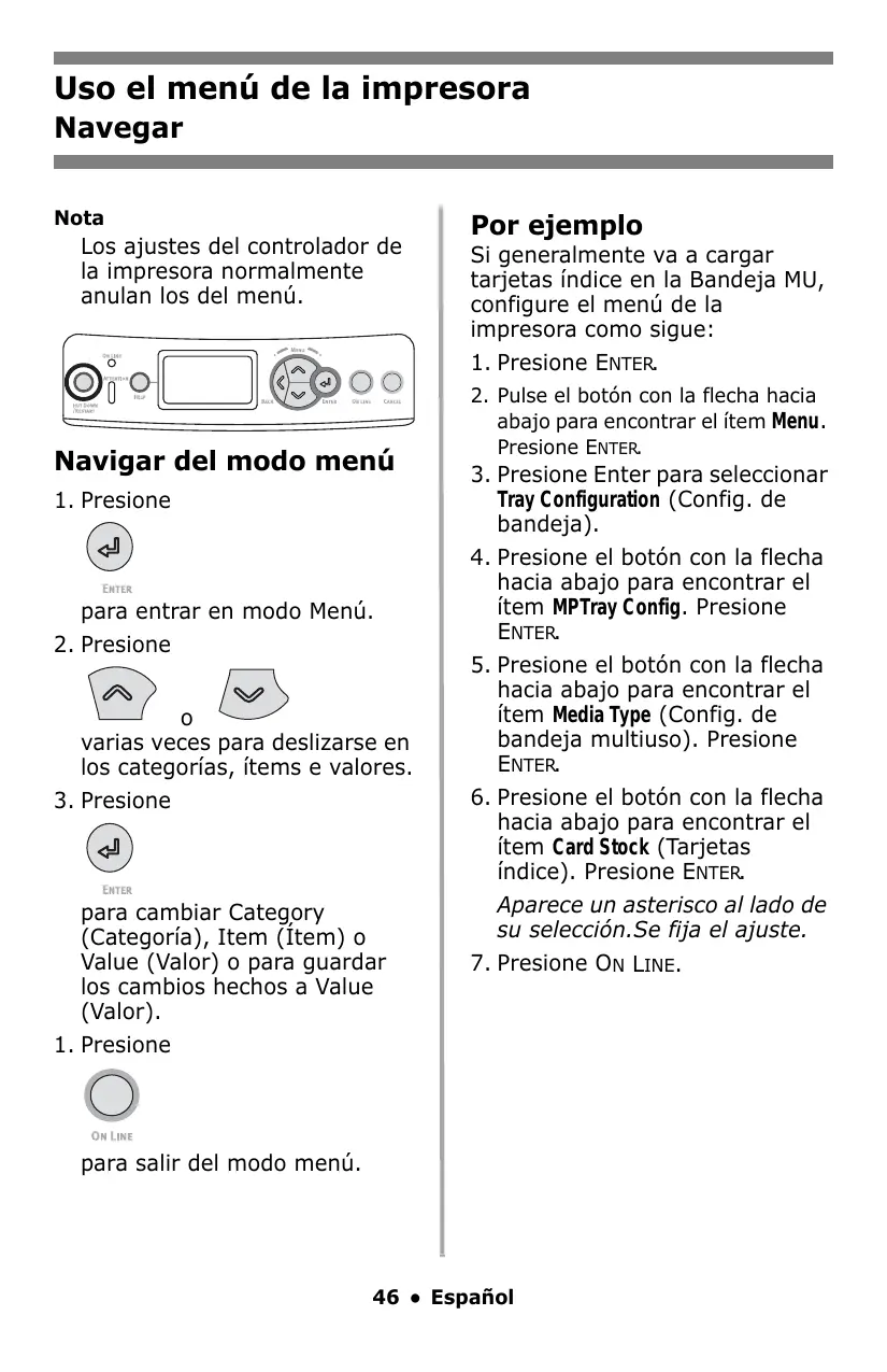 Si generalmente va a cargar tarjetas indices en la Bandeja MU, configure el menu de la impresora como sigue: