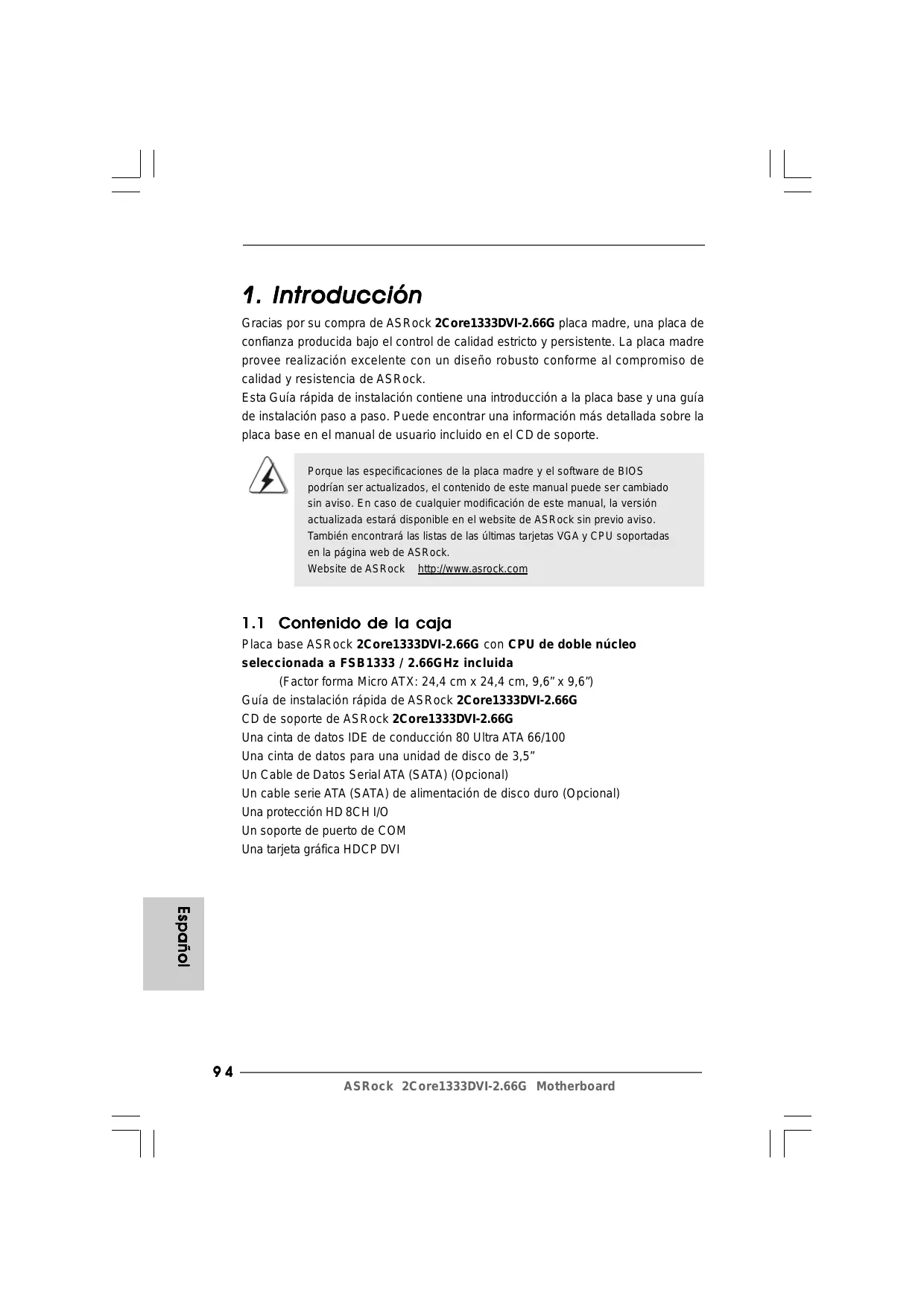 Gracias por su compra de ASRock 2Core1333DVI-2.66G placa madre, una placa de confianza producida bajo el control de calidad estricto y persistente. La placa madre provee realización excelente con un diseño robusto conforme al compromiso de calidad y resistencia de ASRock. Esta Guía rápida de instalación contiene una introducción a la placa base y una guía de instalación paso a paso. Puede encontrar una información más detallada sobre la placa base en el manual de usuario incluido en el CD de soporte. Porque las especificaciones de la placa madre y el software de BIOS podrían ser actualizados, el contenido de este manual puede ser cambiado sin aviso. En caso de cualquier modificación de este manual, la versión actualizada estará disponible en el website de ASRock sin previo aviso. También encontrará las listas de las últimas tarjetas VGA y CPU soportadas en la página web de ASRock. Website de ASRock http://www.asrock.com