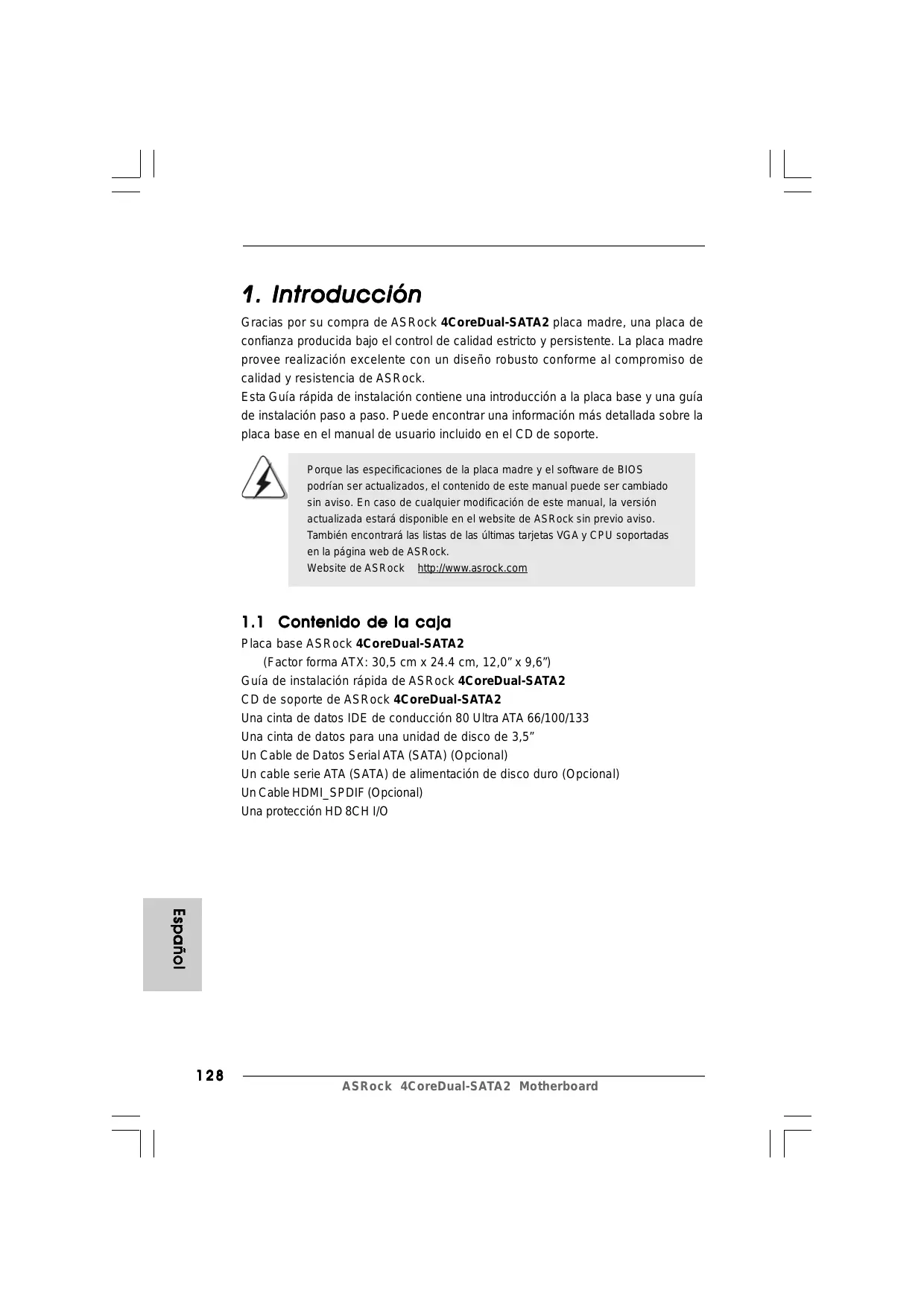Gracias por su compra de ASRock 4CoreDual-SATA2 placa madre, una placa de confianza producida bajo el control de calidad estricto y persistente. La placa madre provee realización excelente con un diseño robusto conforme al compromiso de calidad y resistencia de ASRock. Esta Guía rápida de instalación contiene una introducción a la placa base y una guía de instalación paso a paso. Puede encontrar una información más detallada sobre la placa base en el manual de usuario incluido en el CD de soporte. Porque las especificaciones de la placa madre y el software de BIOS podrían ser actualizados, el contenido de este manual puede ser cambiado sin aviso. En caso de cualquier modificación de este manual, la versión actualizada estará disponible en el website de ASRock sin previo aviso. También encontrará las listas de las últimas tarjetas VGA y CPU soportadas en la página web de ASRock. Website de ASRock http://www.asrock.com