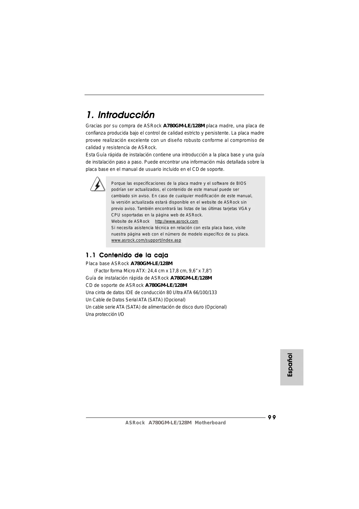 Gracias por su compra de ASRock A780GM-LE/128M placa madre, una placa de confianza producida bajo el control de calidad estricto y persistente. La placa madre provee realización excelente con un diseño robusto conforme al compromiso de calidad y resistencia de ASRock. Esta Guía rápida de instalación contiene una introducción a la placa base y una guía de instalación paso a paso. Puede encontrar una información más detallada sobre la placa base en el manual de usuario incluido en el CD de soporte. Porque las especificaciones de la placa madre y el software de BIOS podrían ser actualizados, el contenido de este manual puede ser cambiado sin aviso. En caso de cualquier modificación de este manual, la versión actualizada estará disponible en el website de ASRock sin previo aviso. También encontrará las listas de las últimas tarjetas VGA y CPU soportadas en la página web de ASRock. Website de ASRock http://www.asrock.com Si necesita asistencia técnica en relación con esta placa base, visite nuestra página web con el número de modelo específico de su placa. www.asrock.com/support/index.asp 1 . 1 Contenido de la caja Español Placa base ASRock A780GM-LE/128M (Factor forma Micro ATX: 24,4 cm x 17,8 cm, 9,6” x 7,8”) Guía de instalación rápida de ASRock A780GM-LE/128M CD de soporte de ASRock A780GM-LE/128M Una cinta de datos IDE de conducción 80 Ultra ATA 66/100/133 Un Cable de Datos Serial ATA (SATA) (Opcional) Un cable serie ATA (SATA) de alimentación de disco duro (Opcional) Una protección I/O