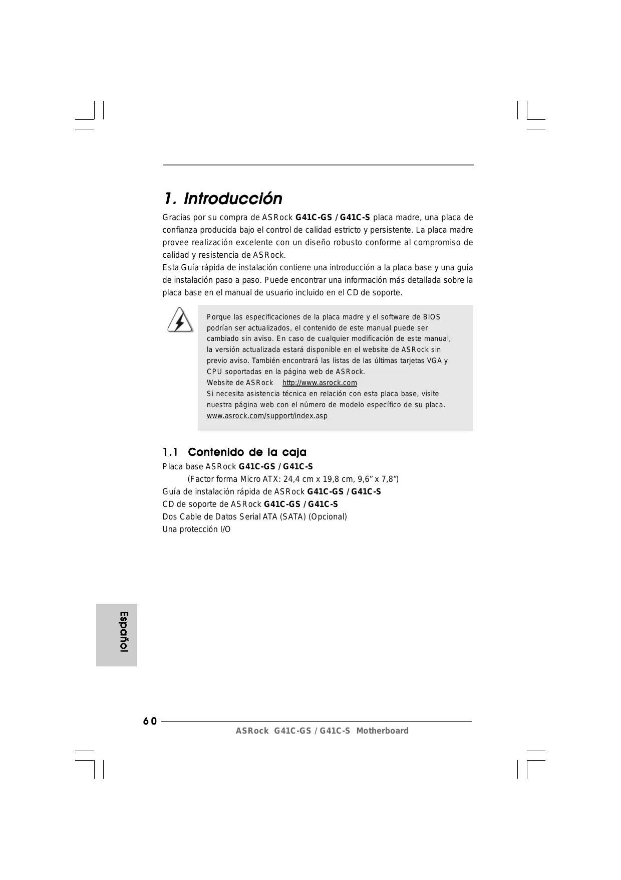 Gracias por su compra de ASRock G41C-GS / G41C-S placa madre, una placa de confianza producida bajo el control de calidad estricto y persistente. La placa madre provee realización excelente con un diseño robusto conforme al compromiso de calidad y resistencia de ASRock. Esta Guía rápida de instalación contiene una introducción a la placa base y una guía de instalación paso a paso. Puede encontrar una información más detallada sobre la placa base en el manual de usuario incluido en el CD de soporte. Porque las especificaciones de la placa madre y el software de BIOS podrían ser actualizados, el contenido de este manual puede ser cambiado sin aviso. En caso de cualquier modificación de este manual, la versión actualizada estará disponible en el website de ASRock sin previo aviso. También encontrará las listas de las últimas tarjetas VGA y CPU soportadas en la página web de ASRock. Website de ASRock http://www.asrock.com Si necesita asistencia técnica en relación con esta placa base, visite nuestra página web con el número de modelo específico de su placa. www.asrock.com/support/index.asp