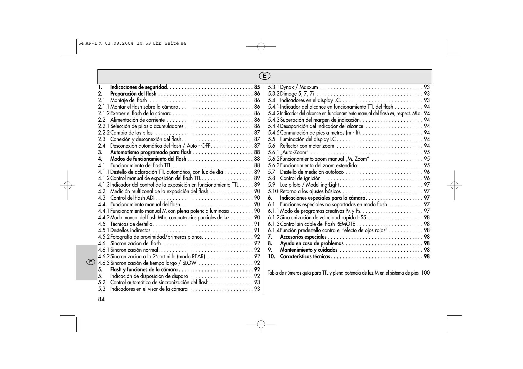 Retirar la suciedad o el polvo con un paño suave, seco o tratado con silico- na. No utilizar detergentes, que pudieran dañar los elementos de pléstico. Formacién del condensador de destellos El condensador de destellos incorporado en el flash, se deforma fisicamente, si el aparato no se conecta durante largos periodos. Por este motivo es nece- sario conectar el flash durante aprox. 10 min., en intervalos trimestrales (observar aqui 2.4]. Las pilas 0 acumuladores deberén tener la sufciente energia para que la indicacién de disposicién de disparo luzca, como méx., 1 min. después de la conexién.