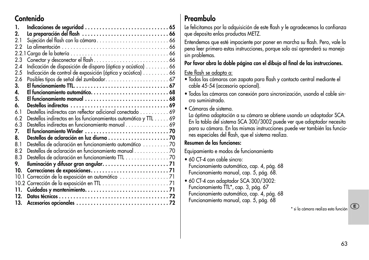 - 60 CT-4 con adaptador SCA 300/3002: Funcionamiento TTL*, cap. 3, pág. 67 Funcionamiento automático, cap. 4, pág. 68 Funcionamiento manual, cap. 5, pág. 68