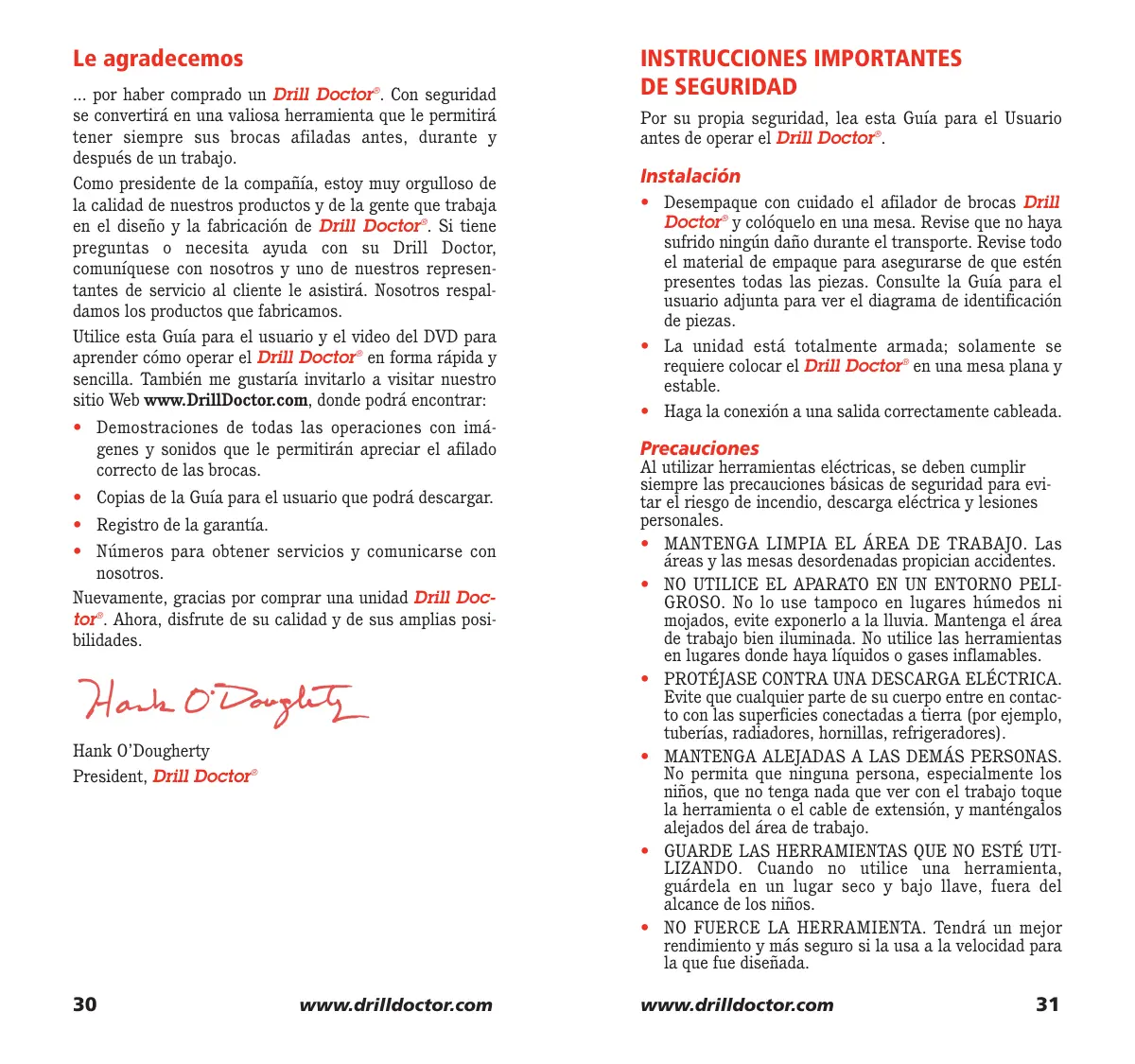 Como presidente de la compañero, estoy muy orgulso de la calidad de nuestros productos y de la gente que trabaja en el Diseño y la fabricacion de Drill Doctor. Si tiene preguntas o necessities adjacency con su Drill Doctor, comuniquese con nosotros y uno de nuestros representantes de servicios al cliente le asistirá. Nosotros respal-damos los productos que fabricamos.