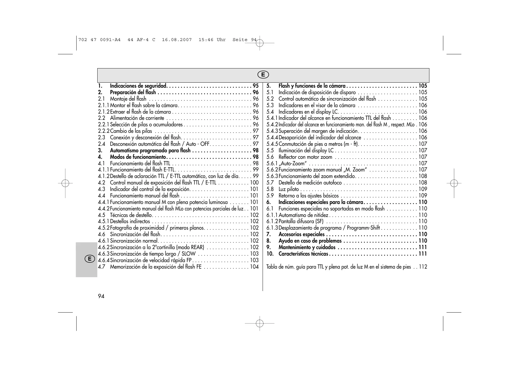 2.2.1 Selecciôn de pilas o acumuladores .96 | 5.4.2Indicador del alcance en funcionamiento man. del flash M, respect. Mo . 106
