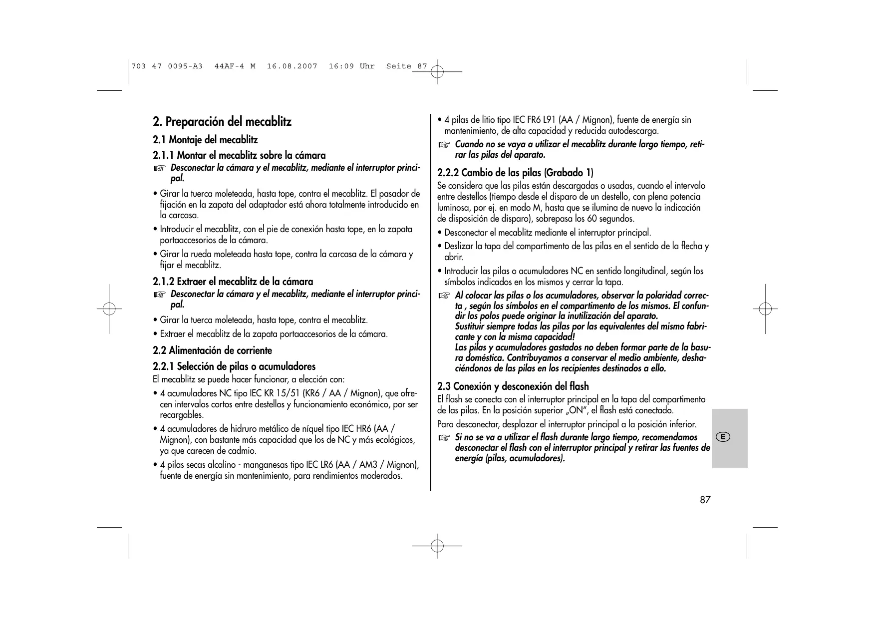 + 4 pilas de litio tipo IEC FR L91 (AA / Mignon), fuente de energia sin mantenimiento, de alta capacidad y reducida autodescarga. 15 Cuando no se vaya a ufilizar el mecablitz durante largo tiempo, reti- rar las pilas del aparato.