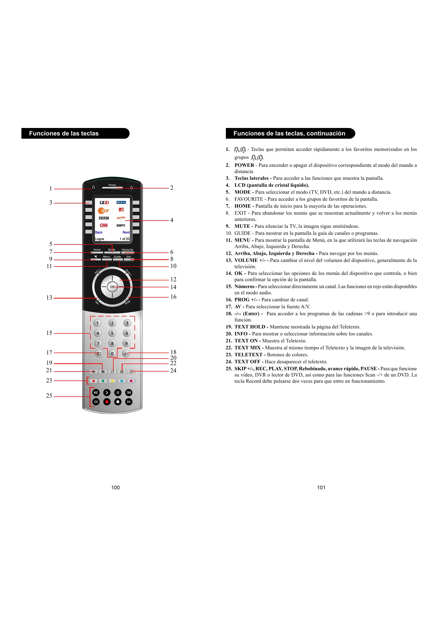 h. Durante el aprendizaje, generalmente no debe soltar la tecla que está realizando el aprendizaje hasta que la pantalla se lo indique. Sin embargo, con este método, puede que en algunos casos el mando a distancia realice varias vezes el aprendizaje de una mesma tecla. Si esta llega a suceder, en vez de Maintener pulsada la tecla, pulsela rápidamente. De este modo, las teclas que generalmente mantiene pulsadas (como VOL +/- ) requérirán que las mantenga pulsadas un cierto tiempo durante el aprendizaje. Asimismo, las teclas que por lo general pulsa rápidamente (como los número y PROG +/- ) tan sólo requérirán que las pulse levamente durante el aprendizaje. Por exemple, si antes del aprendizaje de la tecla PROG + , se da cuenta de que cambia various canales cuando se pulsa una sola vez, vuelva a realizar el aprendizaje pulsando levamente.
