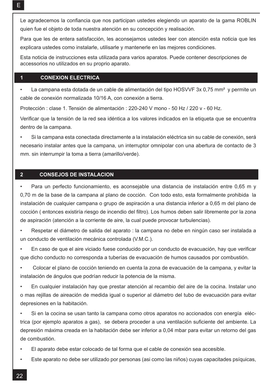 Le agradecemos la confiancia que nos participan ustedes elegiendo un aparato de la gama ROBLIN quien fue el objeto de toda nuestra atenciôn en su concepciôn y realisaciôn. Para que les de entera satisfacciôn, les aconsejamos ustedes leer con atenciôn esta noticia que les explicara ustedes como instalarle, utilisarle y mantenerle en las mejores condiciones. Esta noticia de instrucciones esta utlizada para varios aparatos. Puede contener descripciones de accessorios no utilizados en su proprio aparato.