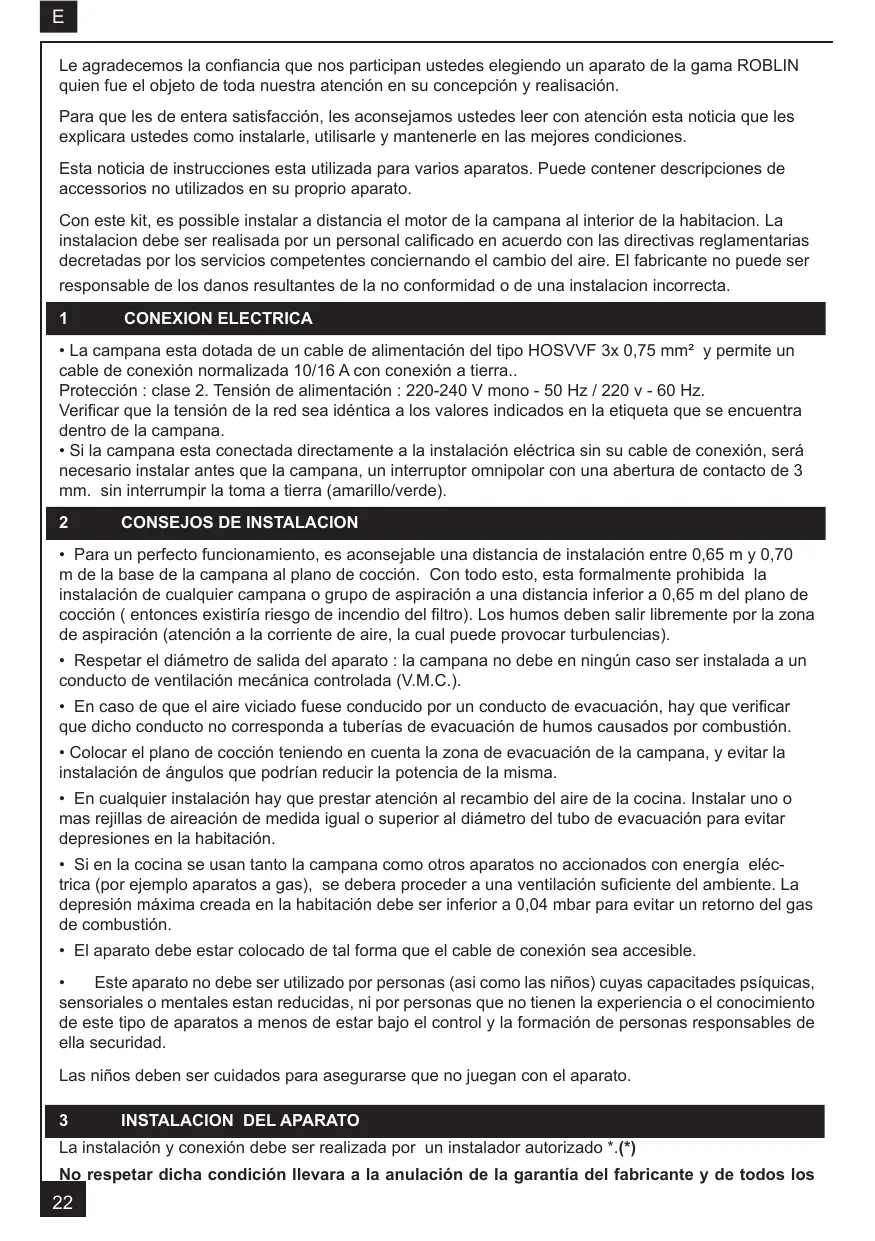 Le agradecemos la confiancia que nos participan ustedes elegiendo un aparato de la gama ROBLIN quien fue el objeto de toda nuestra atención en su concepción y realisación. Para que les de entera satisfacción, les aconsejamos ustedes leer con atención esta noticia que les explicara ustedes como instalarle, utilisarle y mantenerle en las mejores condiciones. Esta noticia de instrucciones esta utilizada para varios aparatos. Puede contener descripciones de accessorios no utilizados en su proprio aparato. Con este kit, es possible instalar a distancia el motor de la campana al interior de la habitacion. La instalacion debe ser realisada por un personal calificado en acuerdo con las directivas reglamentarias decretadas por los servicios competentes conciernando el cambio del aire. El fabricante no puede ser responsable de los danos resultantes de la no conformidad o de una instalacion incorrecta.