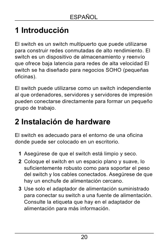 El switch puede utilizarse como un switch independiente al que ordenadores, servidores y servidores de impresiôn pueden conectarse directamente para formar un pequefño grupo de trabajo.