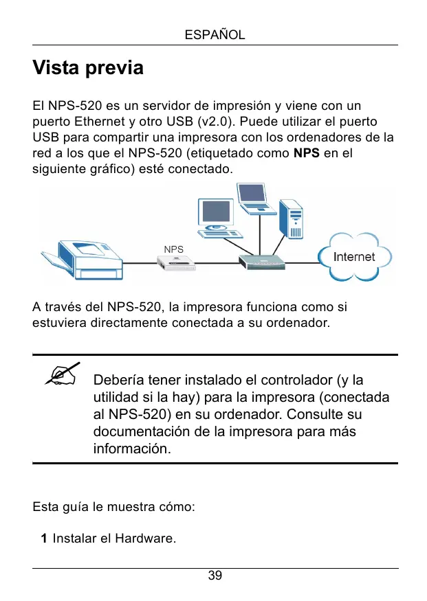 El NPS-520 es un servidor de impresiôn y viene con un puerto Ethernet y otro USB (2.0). Puede utilizar el puerto USB para compartir una impresora con los ordenadores de la red a los que el NPS-520 (etiquetado como NPS en el siguiente gräfico) esté conectado.