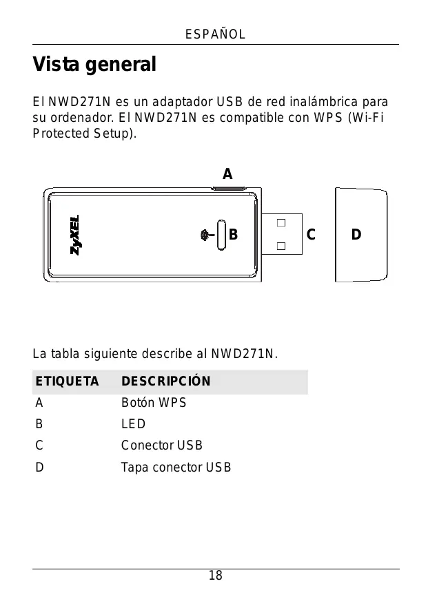 ETIQUETA DESCRIPCIÓN A Botón WPS B LED C Conector USB D