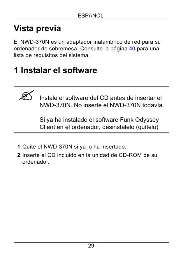 Æ Instale el software del CD antes de insertar el NWD-370N. No inserte el NWD-370N todavia.