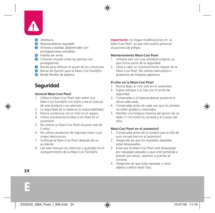 General Maxi-Cosi Pearl 1. Utiliza la Maxi-Cosi Pearl sólo sobre una Maxi-Cosi FamilyFix con IsoFix y lee el manual de este producto con atención. 2. La seguridad de tu bebé es tu responsabilidad. 3. Nunca conduzcas con el niño en el regazo. 4. Utiliza únicamente la Maxi-Cosi Pearl en el automóvil. 5. No utilices la Maxi-Cosi Pearl durante más de 5 años. 6. No utilices productos de segunda mano cuyo origen desconoces. 7. Sustituye la Maxi-Cosi Pearl después de un accidente. 8. Lee este manual con atención y guárdalo en el compartimiento de la Maxi-Cosi FamilyFix.