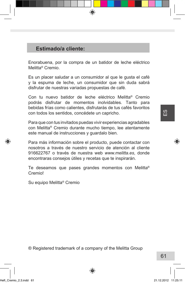 ES Para que con tus invitados puedas vivir experiencias agradables con Melitta® Cremio durante mucho tiempo, lee atentamente este manual de instrucciones y guardalo bien.