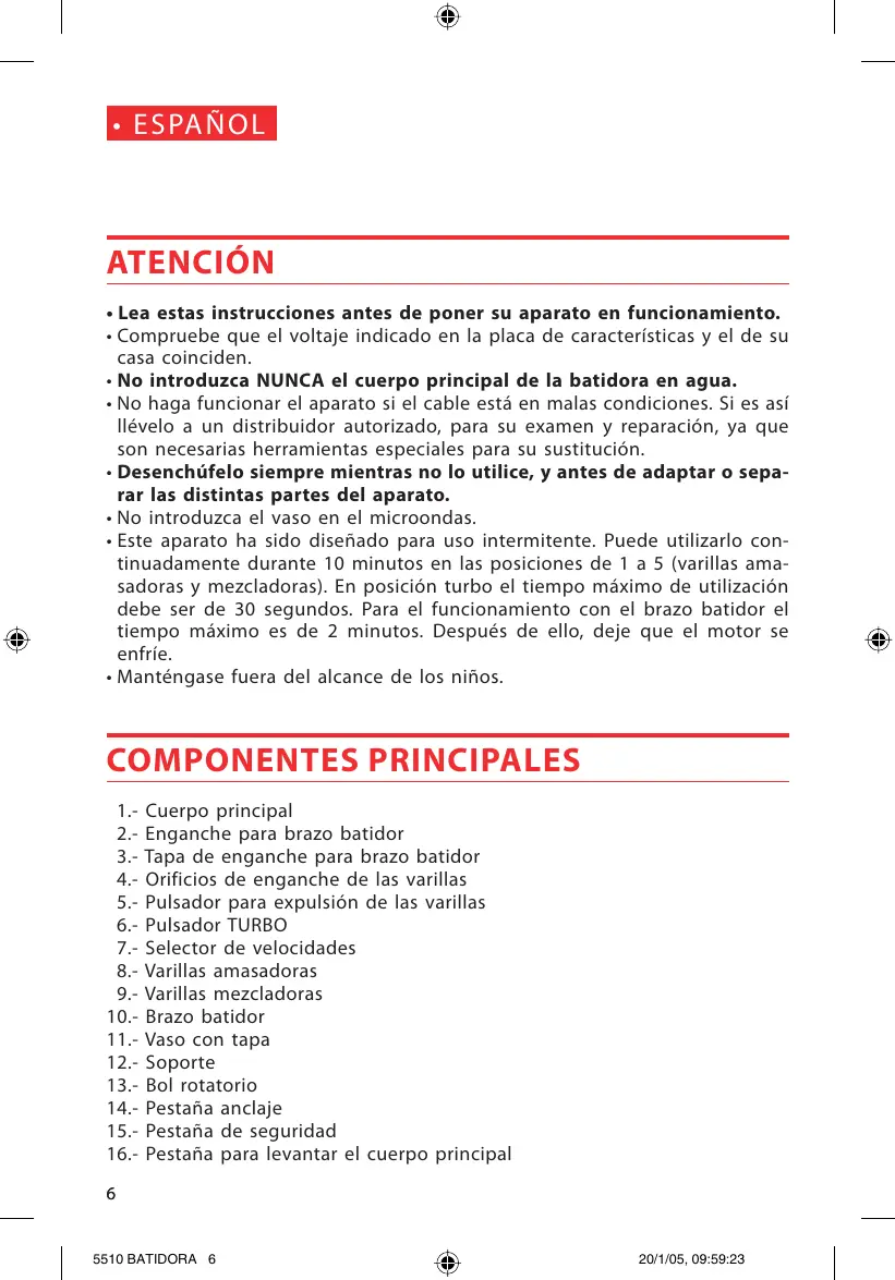 KO] + ESPAN ATENCION + Lea estas instrucciones antes de poner su aparato en funcionamiento. + Compruebe que el voltaje indicado en la placa de caracteristicas y el de su casa coinciden. + No introduzca NUNCA el cuerpo principal de la batidora en agua. + No haga funcionar el aparato si el cable estä en malas condiciones. Si es asi Ilévelo a un distribuidor autorizado, para su examen y reparaciôn, ya que son necesarias herramientas especiales para su sustituciôn. + Desenchüfelo siempre mientras no lo utilice, y antes de adaptar o sepa- rar las distintas partes del aparato. + No introduzca el vaso en el microondas. + Este aparato ha sido diseñado para uso intermitente. Puede utilizarlo con- tinuadamente durante 10 minutos en las posiciones de 1 a 5 (varillas ama- sadoras y mezcladoras). En posiciôn turbo el tiempo méximo de utilizaciôn debe ser de 30 segundos. Para el funcionamiento con el brazo batidor el tiempo mâximo es de 2 minutos. Después de ello, deje que el motor se enfrie. + Manténgase fuera del alcance de los niños. COMPONENTES PRINCIPALES 1.- Cuerpo principal Enganche para brazo batidor Tapa de enganche para brazo batidor - Orificios de enganche de las varillas Pulsador para expulsiôn de las varillas Pulsador TURBO Selector de velocidades - Varillas amasadoras Varillas mezcladoras Brazo batidor Vaso con tapa + Soporte Bol rotatorio Pestaña anclaje Pestaña de seguridad Pestaña para levantar el cuerpo principal 6510 BATIDORA 6 20/1/05, 09:59:23 KO]