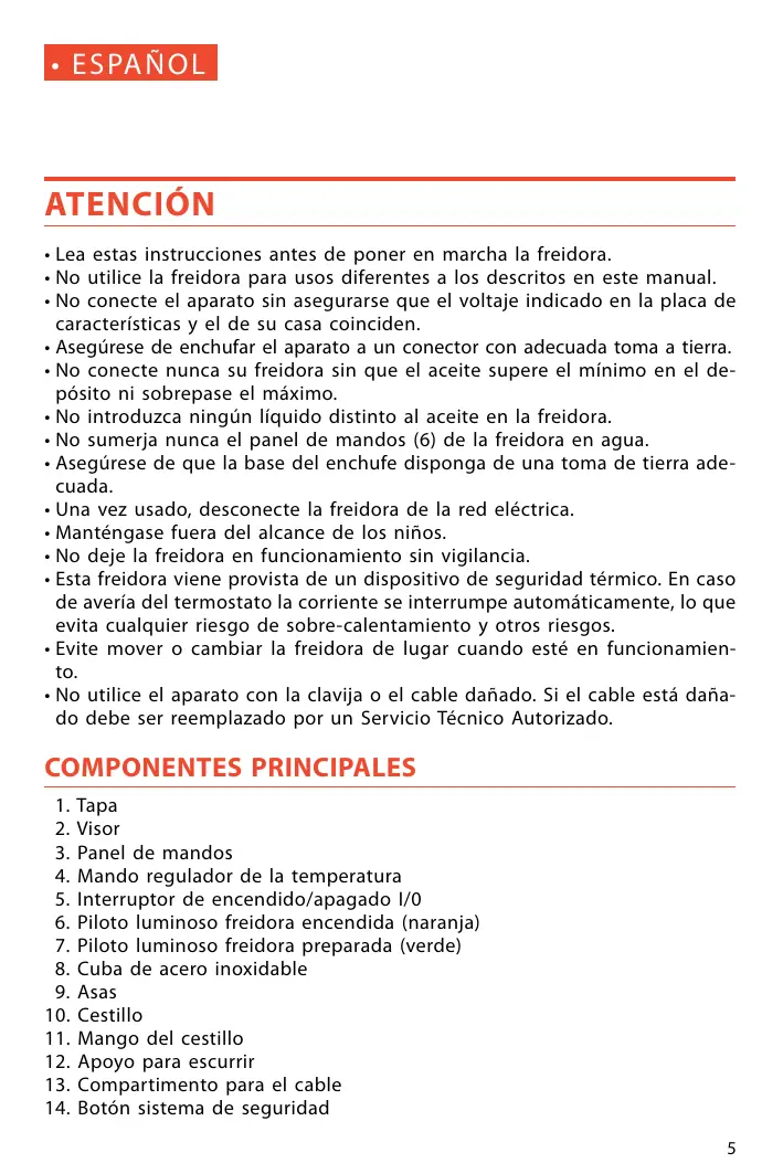 + ESPANOL ATENCION + Lea estas instrucciones antes de poner en marcha la freidora. + No utilice la freidora para usos diferentes a los descritos en este manual. + No conecte el aparato sin asegurarse que el voltaje indicado en la placa de caracteristicas y el de su casa coinciden. + Asegürese de enchufar el aparato a un conector con adecuada toma a tierra. + No conecte nunca su freidora sin que el aceite supere el minimo en el de- pésito ni sobrepase el mäximo. + No introduzca ningün liquido distinto al aceite en la freidora. + No sumerja nunca el panel de mandos (6) de la freidora en agua. + Asegürese de que la base del enchufe disponga de una toma de tierra ade- cuada. + Una vez usado, desconecte la freidora de la red eléctrica. + Manténgase fuera del alcance de los niños. + No deje la freidora en funcionamiento sin vigilancia. + Esta freidora viene provista de un dispositivo de seguridad térmico. En caso de averia del termostato la corriente se interrumpe automäticamente, lo que evita cualquier riesgo de sobre-calentamiento y otros riesgos. + Evite mover o cambiar la freidora de lugar cuando esté en funcionamien- to. + No utilice el aparato con la clavija o el cable dañado. Si el cable esté daña- do debe ser reemplazado por un Servicio Técnico Autorizado. COMPONENTES PRINCIPALES