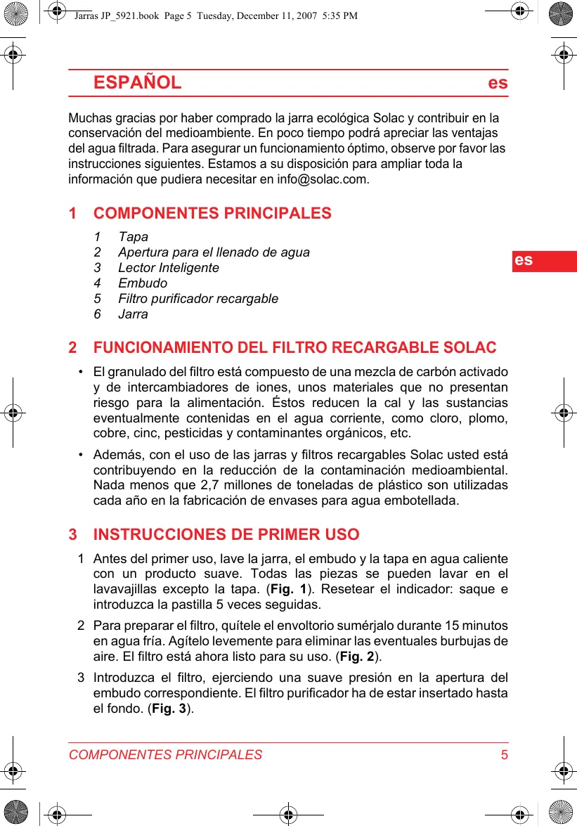 Muchasgracias por haber comprado la jarra ecologica Solac y contribuiren en la conservacion del medioambiente. En poco tiempo podraajsrear las ventajas del agua filtrada. Para asegurar un functionamento optimo,observe por favor las instrucciones seguentes. Estamos a su disposicion para ampliar toda la informacion que pudiera necessitar en info@solac.com.