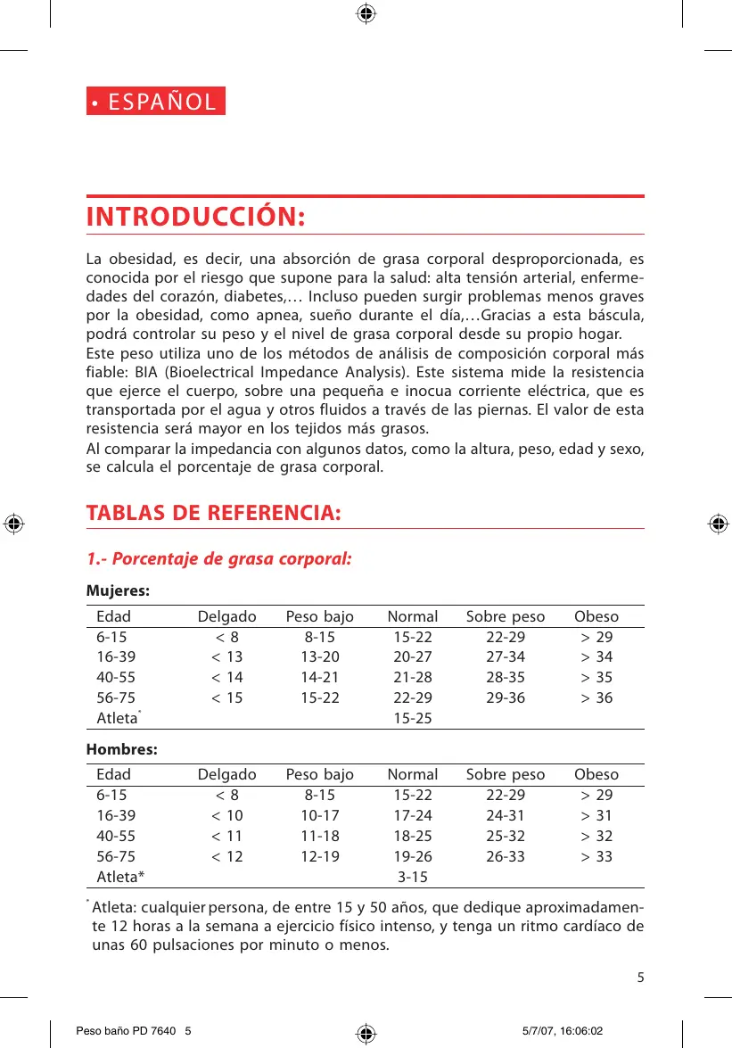 KO] ESPA INTRODUCCION: La obesidad, es decir, una absorciôn de grasa corporal desproporcionada, es conocida por el riesgo que supone para la salud: alta tensién arterial, enferme- dades del corazén, diabetes. Incluso pueden surgir problemas menos graves por la obesidad, como apnea, sueño durante el dia…Gracias a esta béscula, podré controlar su peso y el nivel de grasa corporal desde su propio hogar. Este peso utiliza uno de los métodos de anélisis de composiciôn corporal ms fiable: BIA (Bioelectrical Impedance Analysis). Este sistema mide la resistencia que ejerce el cuerpo, sobre una pequeña e inocua corriente eléctrica, que es transportada por el agua y otros fluidos a través de las piernas. El valor de esta resistencia serâ mayor en los tejidos més grasos. Al comparar la impedancia con algunos datos, como la altura, peso, edad y sexo, se calcula el porcentaje de grasa corporal. TABLAS DE REFERENCIA: 1.- Porcentaje de grasa corporal: Mujeres: Edad Delgado Pesobajo Normal Sobrepeso Obeso 6-15 <8 8-15 15-22 22-29 > 29 16-39 <13 13-20 20-27 27-34 > 34 40-55 <14 14-21 21-28 28-35 > 35 56-75 <15 15-22 22-29 29-36 > 36 Atleta' 15-25 Hombres: Edad Delgado Pesobajo Normal Sobrepeso Obeso 615 <8 8-15 15-22 22-29 > 29 16-39 <10 10-17 17-24 24-31 >31 40-55 <11 1-18 18-25 25-32 > 32 56-75 <12 12-19 19-26 26-33 > 33 Atleta* 3-15 ‘’Atleta: cualquier persona, de entre 15 y 50 años, que dedique aproximadamen- te 12 horas à la semana a ejercicio fisico intenso, y tenga un ritmo cardiaco de unas 60 pulsaciones por minuto o menos. Peso baño PD 7640 5 S/7107, 16:06:02