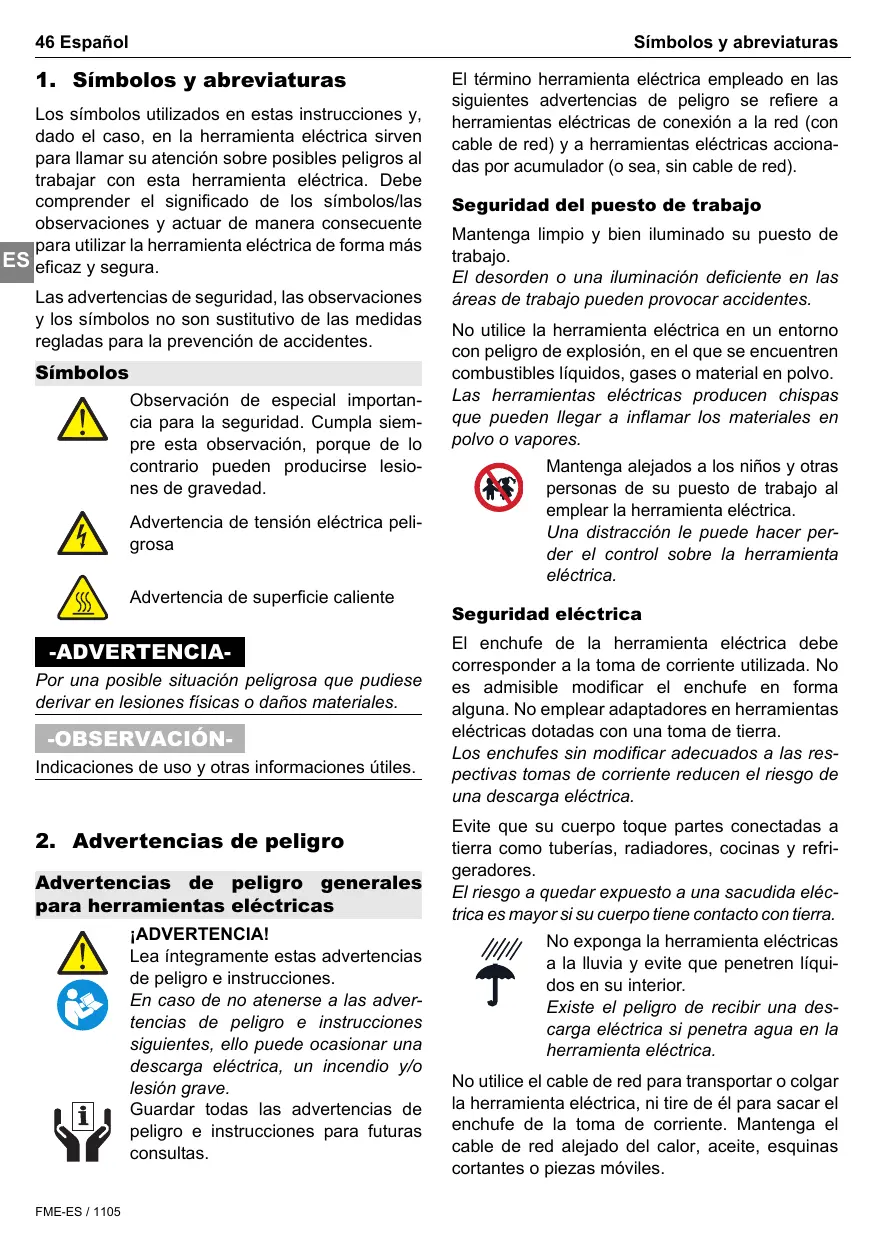 Advertencias de peligro generales para herramientas eléctricas ¡ADVERTENCIA! Lea íntegramente estas advertencias de peligro e instrucciones. En caso de no atenerse a las advertencias de peligro e instrucciones siguientes, ello puede ocasionar una descarga eléctrica, un incendio y/o lesión grave. Guardar todas las advertencias de peligro e instrucciones para futuras consultas. FME-ES / 1105 El término herramienta eléctrica empleado en las siguientes advertencias de peligro se refiere a herramientas eléctricas de conexión a la red (con cable de red) y a herramientas eléctricas accionadas por acumulador (o sea, sin cable de red). Seguridad del puesto de trabajo Mantenga limpio y bien iluminado su puesto de trabajo. El desorden o una iluminación deficiente en las áreas de trabajo pueden provocar accidentes. No utilice la herramienta eléctrica en un entorno con peligro de explosión, en el que se encuentren combustibles líquidos, gases o material en polvo. Las herramientas eléctricas producen chispas que pueden llegar a inflamar los materiales en polvo o vapores. Mantenga alejados a los niños y otras personas de su puesto de trabajo al emplear la herramienta eléctrica. Una distracción le puede hacer perder el control sobre la herramienta eléctrica. Seguridad eléctrica El enchufe de la herramienta eléctrica debe corresponder a la toma de corriente utilizada. No es admisible modificar el enchufe en forma alguna. No emplear adaptadores en herramientas eléctricas dotadas con una toma de tierra. Los enchufes sin modificar adecuados a las respectivas tomas de corriente reducen el riesgo de una descarga eléctrica. Evite que su cuerpo toque partes conectadas a tierra como tuberías, radiadores, cocinas y refrigeradores. El riesgo a quedar expuesto a una sacudida eléctrica es mayor si su cuerpo tiene contacto con tierra. No exponga la herramienta eléctricas a la lluvia y evite que penetren líquidos en su interior. Existe el peligro de recibir una descarga eléctrica si penetra agua en la herramienta eléctrica. No utilice el cable de red para transportar o colgar la herramienta eléctrica, ni tire de él para sacar el enchufe de la toma de corriente. Mantenga el cable de red alejado del calor, aceite, esquinas cortantes o piezas móviles. Advertencias de peligro Los cables de red dañados o enredados pueden provocar una descarga eléctrica. Al trabajar con la herramienta eléctrica a la intemperie utilice solamente cables de prolongación apropiados para su uso en exteriores. La utilización de un cable de prolongación adecuado para su uso en exteriores reduce el riesgo de una descarga eléctrica. Si fuese imprescindible utilizar la herramienta eléctrica en un entorno húmedo, es necesario conectarla a través de un fusible diferencial. La aplicación de un fusible diferencial reduce el riesgo a exponerse a una descarga eléctrica. Seguridad de personas Esté atento a lo que hace y emplee la herramienta eléctrica con prudencia. No utilice la herramienta eléctrica si estuviese cansado, ni tampoco después de haber consumido alcohol, drogas o medicamentos. El no estar atento durante el uso de la herramienta eléctrica puede provocarle serias lesiones. Utilice un equipo de protección y en todo caso unas gafas de protección. El riesgo a lesionarse se reduce considerablemente si, dependiendo del tipo y la aplicación de la herramienta eléctrica empleada, se utiliza un equipo de protección adecuado como una mascarilla antipolvo, zapatos de seguridad con suela antideslizante, casco, o protectores auditivos. Evite una puesta en marcha fortuita. Asegurarse de que la herramienta eléctrica esté desconectada antes de conectarla a la toma de corriente y/o al montar el acumulador, al recogerla, y al transportarla. Si transporta la herramienta eléctrica sujetándola por el interruptor de conexión/ desconexión, o si introduce el enchufe en la toma de corriente con la herramienta eléctrica conectada, ello puede dar lugar a un accidente. Retire las herramientas de ajuste o llaves fijas antes de conectar la herramienta eléctrica. Una herramienta de ajuste o llave fija colocada en una pieza rotante puede producir lesiones al poner a funcionar la herramienta eléctrica. Español 47 Evite posturas arriesgadas. Trabaje sobre una base firme y mantenga el equilibrio en todo momento. Ello le permitirá controlar mejor la herramienta eléctrica en caso de presentarse una situación inesperada. Lleve puesta una vestimenta de trabajo adecuada. No utilice vestimenta amplia ni joyas. Mantenga su pelo, vestimenta y guantes alejados de las piezas móviles. La vestimenta suelta, el pelo largo y las joyas se pueden enganchar con las piezas en movimiento. Siempre que sea posible utilizar unos equipos de aspiración o captación de polvo, asegúrese que éstos estén montados y que sean utilizados correctamente. El empleo de estos equipos reduce los riesgos derivados del polvo. Uso y trato cuidadoso de herramientas eléctricas No sobrecargue la herramienta eléctrica. Use la herramienta eléctrica prevista para el trabajo a realizar. Con la herramienta adecuada podrá trabajar mejor y más seguro dentro del margen de potencia indicado. No utilice herramientas eléctricas con un interruptor defectuoso. Las herramientas eléctricas que no se puedan conectar o desconectar son peligrosas y deben hacerse reparar. Saque el enchufe de la red y/o desmonte el acumulador antes de realizar un ajuste en la herramienta eléctrica, cambiar de accesorio o al guardar la herramienta eléctrica. Esta medida preventiva reduce el riesgo a conectar accidentalmente la herramienta eléctrica. Guarde las herramientas eléctricas fuera del alcance de los niños. No permita la utilización de la herramienta eléctrica a aquellas personas que no estén familiarizadas con su uso o que no hayan leído estas instrucciones. Las herramientas eléctricas utilizadas por personas inexpertas son peligrosas. Cuide la herramienta elé