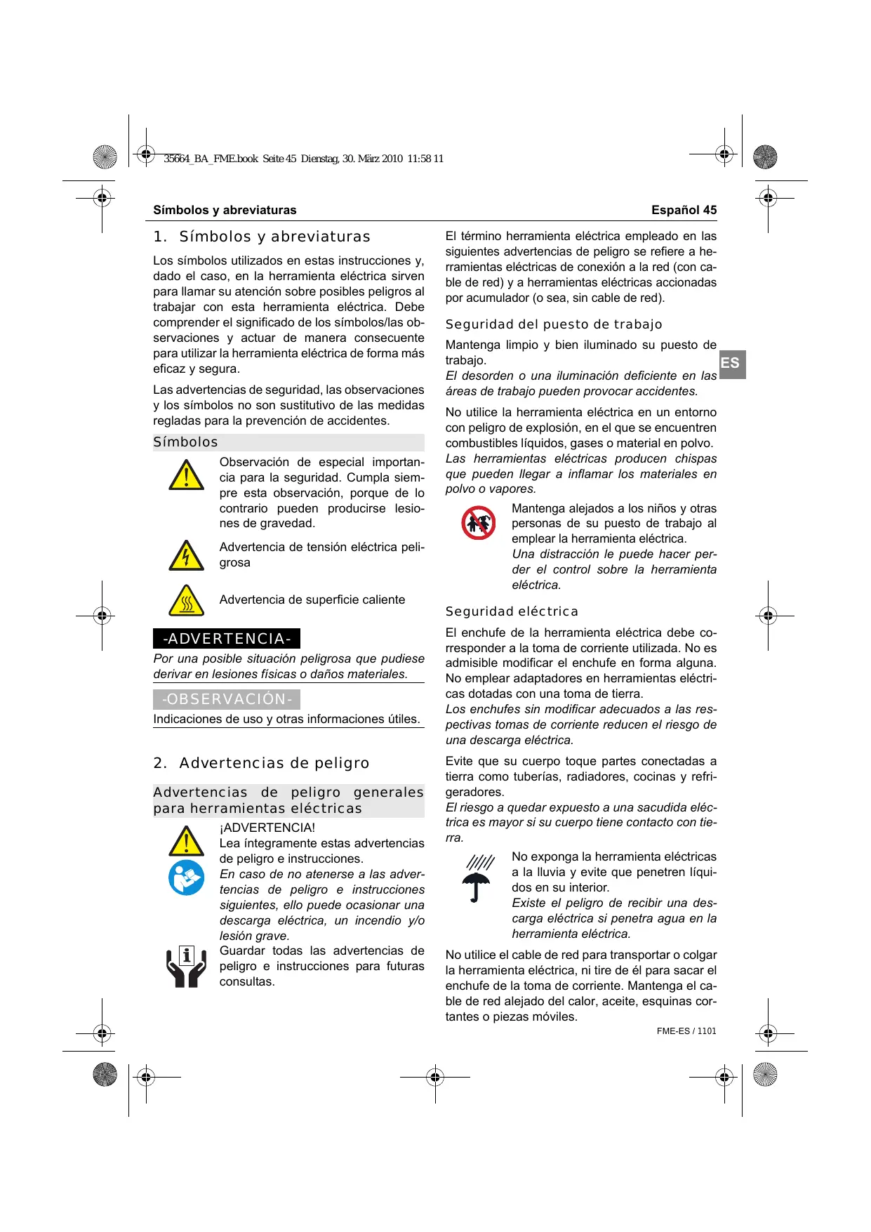 Advertencias de peligro generales para herramientas eléctricas ¡ADVERTENCIA! Lea íntegramente estas advertencias de peligro e instrucciones. En caso de no atenerse a las advertencias de peligro e instrucciones siguientes, ello puede ocasionar una descarga eléctrica, un incendio y/o lesión grave. Guardar todas las advertencias de peligro e instrucciones para futuras consultas. Español 45 El término herramienta eléctrica empleado en las siguientes advertencias de peligro se refiere a herramientas eléctricas de conexión a la red (con cable de red) y a herramientas eléctricas accionadas por acumulador (o sea, sin cable de red). Seguridad del puesto de trabajo Mantenga limpio y bien iluminado su puesto de trabajo. El desorden o una iluminación deficiente en las áreas de trabajo pueden provocar accidentes. No utilice la herramienta eléctrica en un entorno con peligro de explosión, en el que se encuentren combustibles líquidos, gases o material en polvo. Las herramientas eléctricas producen chispas que pueden llegar a inflamar los materiales en polvo o vapores. Mantenga alejados a los niños y otras personas de su puesto de trabajo al emplear la herramienta eléctrica. Una distracción le puede hacer perder el control sobre la herramienta eléctrica. Seguridad eléctrica El enchufe de la herramienta eléctrica debe corresponder a la toma de corriente utilizada. No es admisible modificar el enchufe en forma alguna. No emplear adaptadores en herramientas eléctricas dotadas con una toma de tierra. Los enchufes sin modificar adecuados a las respectivas tomas de corriente reducen el riesgo de una descarga eléctrica. Evite que su cuerpo toque partes conectadas a tierra como tuberías, radiadores, cocinas y refrigeradores. El riesgo a quedar expuesto a una sacudida eléctrica es mayor si su cuerpo tiene contacto con tierra. No exponga la herramienta eléctricas a la lluvia y evite que penetren líquidos en su interior. Existe el peligro de recibir una descarga eléctrica si penetra agua en la herramienta eléctrica. No utilice el cable de red para transportar o colgar la herramienta eléctrica, ni tire de él para sacar el enchufe de la toma de corriente. Mantenga el cable de red alejado del calor, aceite, esquinas cortantes o piezas móviles. FME-ES / 1101 Advertencias de peligro Los cables de red dañados o enredados pueden provocar una descarga eléctrica. Al trabajar con la herramienta eléctrica a la intemperie utilice solamente cables de prolongación apropiados para su uso en exteriores. La utilización de un cable de prolongación adecuado para su uso en exteriores reduce el riesgo de una descarga eléctrica. ES Si fuese imprescindible utilizar la herramienta eléctrica en un entorno húmedo, es necesario conectarla a través de un fusible diferencial. La aplicación de un fusible diferencial reduce el riesgo a exponerse a una descarga eléctrica. Seguridad de personas Esté atento a lo que hace y emplee la herramienta eléctrica con prudencia. No utilice la herramienta eléctrica si estuviese cansado, ni tampoco después de haber consumido alcohol, drogas o medicamentos. El no estar atento durante el uso de la herramienta eléctrica puede provocarle serias lesiones. Utilice un equipo de protección y en todo caso unas gafas de protección. El riesgo a lesionarse se reduce considerablemente si, dependiendo del tipo y la aplicación de la herramienta eléctrica empleada, se utiliza un equipo de protección adecuado como una mascarilla antipolvo, zapatos de seguridad con suela antideslizante, casco, o protectores auditivos. Evite una puesta en marcha fortuita. Asegurarse de que la herramienta eléctrica esté desconectada antes de conectarla a la toma de corriente y/o al montar el acumulador, al recogerla, y al transportarla. Si transporta la herramienta eléctrica sujetándola por el interruptor de conexión/ desconexión, o si introduce el enchufe en la toma de corriente con la herramienta eléctrica conectada, ello puede dar lugar a un accidente. Retire las herramientas de ajuste o llaves fijas antes de conectar la herramienta eléctrica. Una herramienta de ajuste o llave fija colocada en una pieza rotante puede producir lesiones al poner a funcionar la herramienta eléctrica. FME-ES / 1101 Evite posturas arriesgadas. Trabaje sobre una base firme y mantenga el equilibrio en todo momento. Ello le permitirá controlar mejor la herramienta eléctrica en caso de presentarse una situación inesperada. Lleve puesta una vestimenta de trabajo adecuada. No utilice vestimenta amplia ni joyas. Mantenga su pelo, vestimenta y guantes alejados de las piezas móviles. La vestimenta suelta, el pelo largo y las joyas se pueden enganchar con las piezas en movimiento. Siempre que sea posible utilizar unos equipos de aspiración o captación de polvo, asegúrese que éstos estén montados y que sean utilizados correctamente. El empleo de estos equipos reduce los riesgos derivados del polvo. Uso y trato cuidadoso de herramientas eléctricas No sobrecargue la herramienta eléctrica. Use la herramienta eléctrica prevista para el trabajo a realizar. Con la herramienta adecuada podrá trabajar mejor y más seguro dentro del margen de potencia indicado. No utilice herramientas eléctricas con un interruptor defectuoso. Las herramientas eléctricas que no se puedan conectar o desconectar son peligrosas y deben hacerse reparar. Saque el enchufe de la red y/o desmonte el acumulador antes de realizar un ajuste en la herramienta eléctrica, cambiar de accesorio o al guardar la herramienta eléctrica. Esta medida preventiva reduce el riesgo a conectar accidentalmente la herramienta eléctrica. Guarde las herramientas eléctricas fuera del alcance de los niños. No permita la utilización de la herramienta eléctrica a aquellas personas que no estén familiarizadas con su uso o que no hayan leído estas instrucciones. Las herramientas eléctricas utilizadas por personas inexpertas son peligrosas. Cuide la