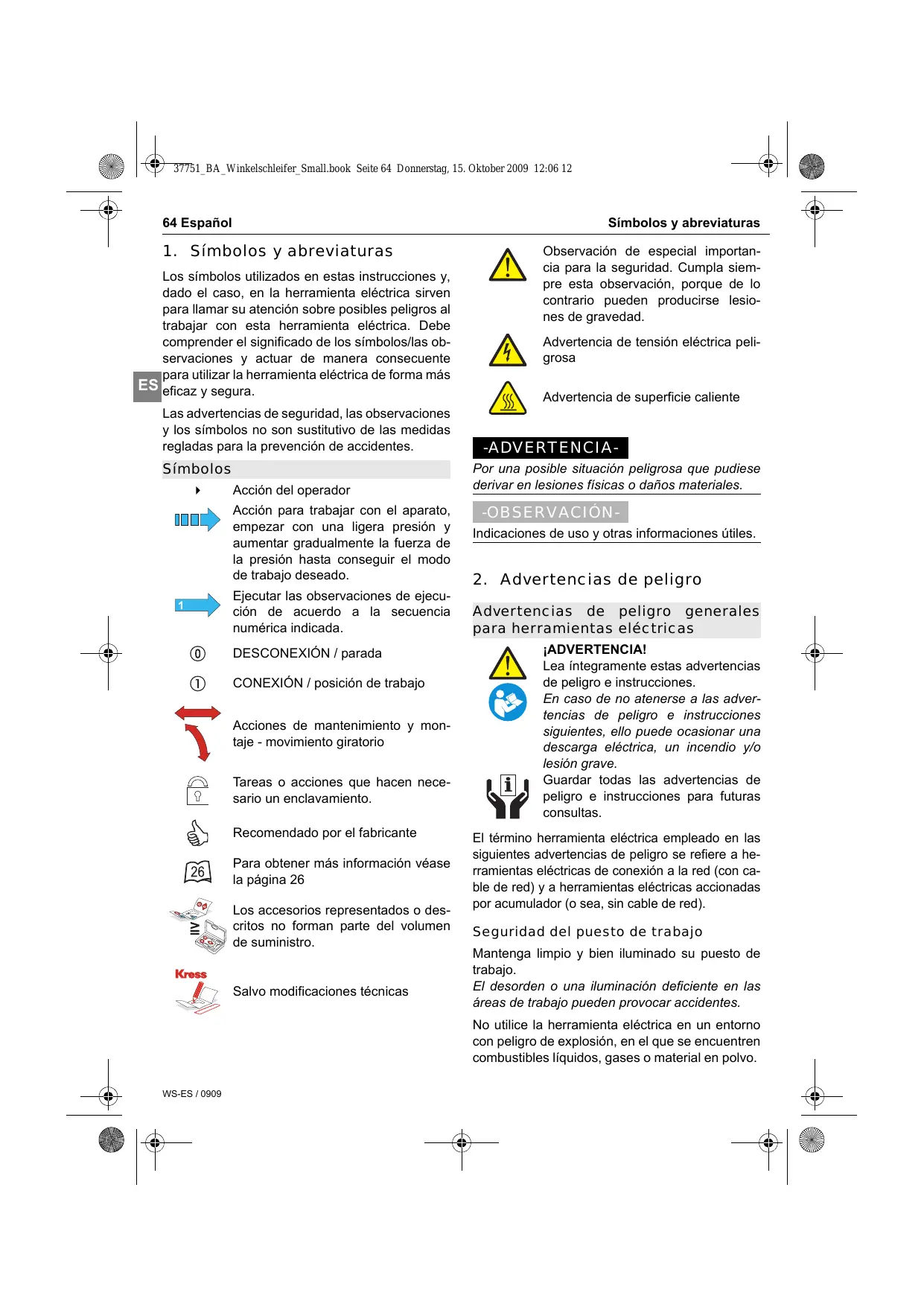 Acción del operador Acción para trabajar con el aparato, empezar con una ligera presión y aumentar gradualmente la fuerza de la presión hasta conseguir el modo de trabajo deseado. Ejecutar las observaciones de ejecución de acuerdo a la secuencia numérica indicada. DESCONEXIÓN / parada CONEXIÓN / posición de trabajo Acciones de mantenimiento y montaje - movimiento giratorio Tareas o acciones que hacen necesario un enclavamiento. Recomendado por el fabricante Para obtener más información véase la página 26 Los accesorios representados o descritos no forman parte del volumen de suministro. Salvo modificaciones técnicas Observación de especial importancia para la seguridad. Cumpla siempre esta observación, porque de lo contrario pueden producirse lesiones de gravedad. Advertencia de tensión eléctrica peligrosa Advertencia de superficie caliente -ADVERTENCIAPor una posible situación peligrosa que pudiese derivar en lesiones físicas o daños materiales. -OBSERVACIÓNIndicaciones de uso y otras informaciones útiles.
