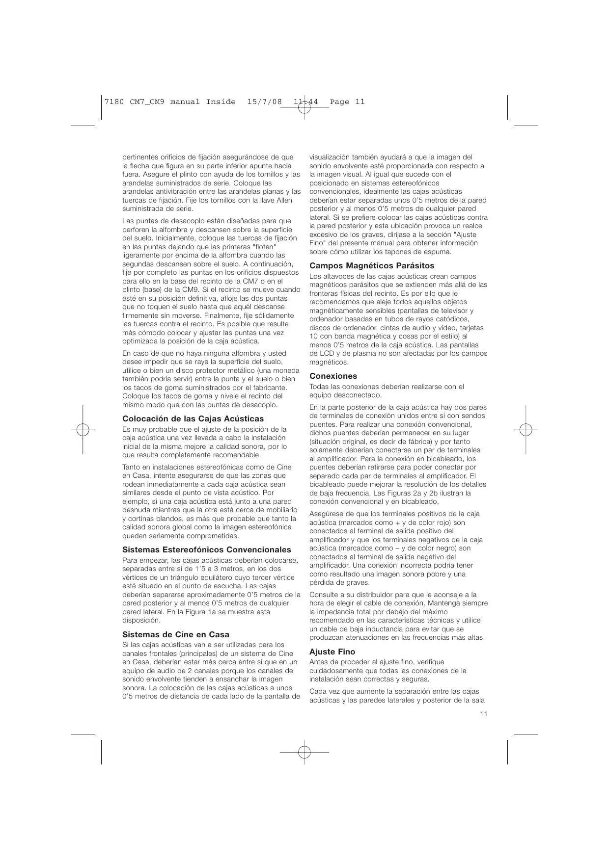 Los altavoces de las cajas acústicas crean campos magnéticos parásitos que se extienden más allá de las fronteras físicas del recinto. Es por ello que le recomendamos que aleje todos aquellos objetos magnéticamente sensibles (pantallas de televisor y ordenador basadas en tubos de rayos catódicos, discos de ordenador, cintas de audio y vídeo, tarjetas 10 con banda magnética y cosas por el estilo) al menos 0’5 metros de la caja acústica. Las pantallas de LCD y de plasma no son afectadas por los campos magnéticos.