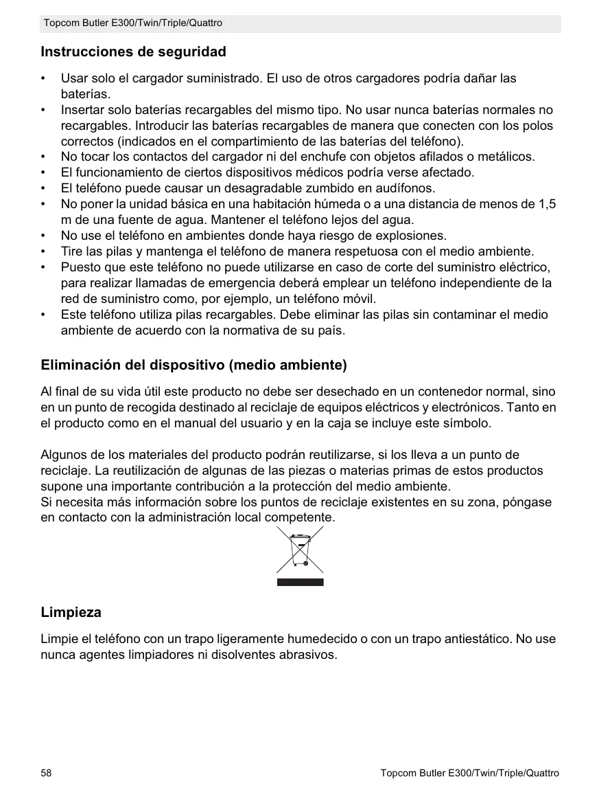 Insertar solo baterías recargables del mismo tipo. No usar nunca baterías normales no recargables. Introducir las baterías recargables de manera que conecten con los polos correctos (indicados en el compartimiento de las baterías del teléfono). No tocar los contactos del cargador ni del enchufe con objetos afilados o metálicos. El funcionamiento de ciertos dispositivos médicos podría verse afectado. El teléfono puede causar un desagradable zumbido en audífonos. No poner la unidad básica en una habitación húmeda o a una distancia de menos de 1,5 m de una fuente de agua. Mantener el teléfono lejos del agua. No use el teléfono en ambientes donde haya riesgo de explosiones. Tire las pilas y mantenga el teléfono de manera respetuosa con el medio ambiente. Puesto que este teléfono no puede utilizarse en caso de corte del suministro eléctrico, para realizar llamadas de emergencia deberá emplear un teléfono independiente de la red de suministro como, por ejemplo, un teléfono móvil. Este teléfono utiliza pilas recargables. Debe eliminar las pilas sin contaminar el medio ambiente de acuerdo con la normativa de su país.
