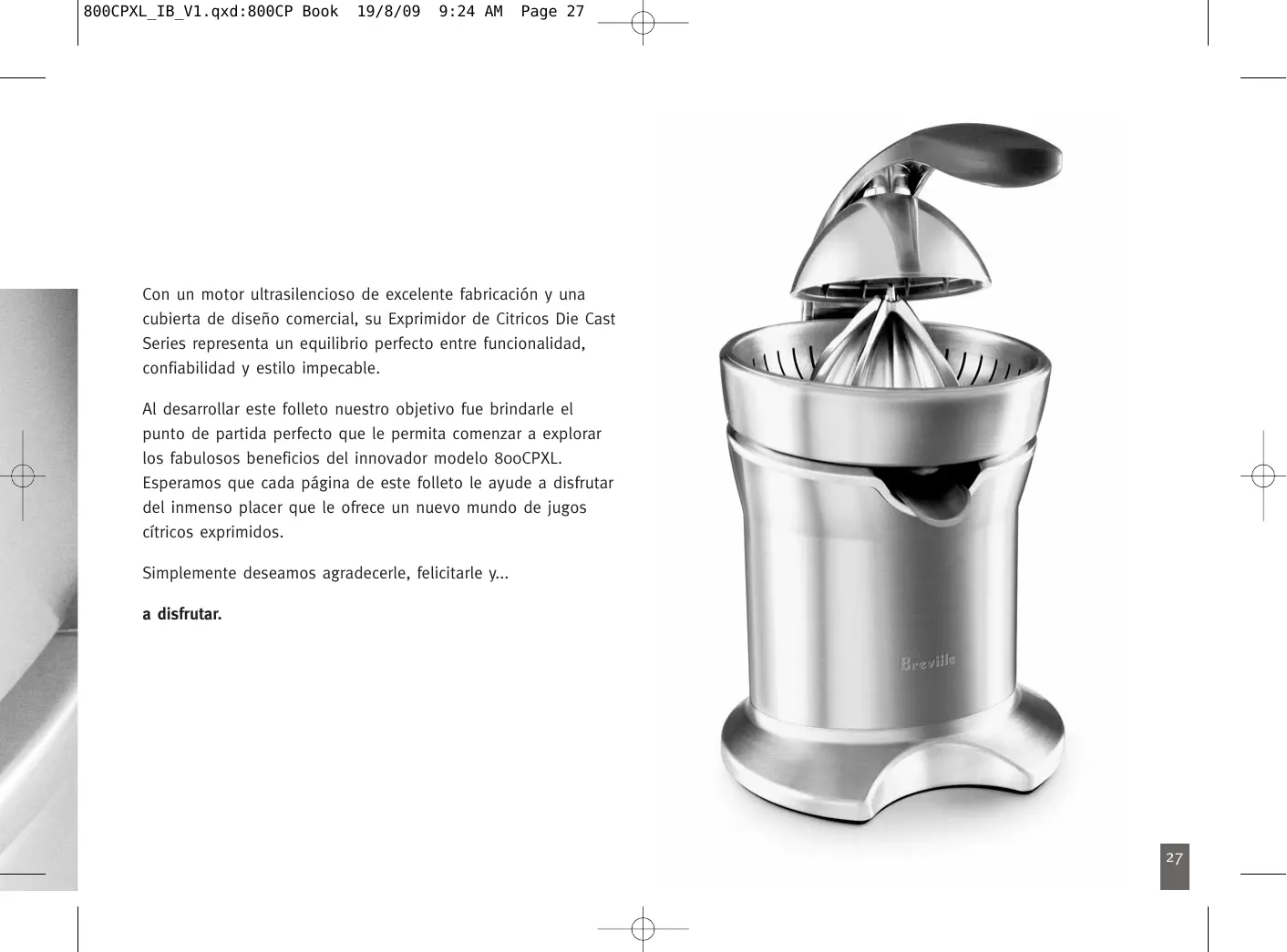 800CPXL_IB_V1.qxd:800CP Book 19/8/09 9:24 AM Page 27 e Con un motor ultrasilencioso de excelente fabricaciôn y una cubierta de diseño comercial, su Exprimidor de Citricos Die Cast Series representa un equilibrio perfecto entre funcionalidad, confiabilidad y estilo impecable. Al desarrollar este folleto nuestro objetivo fue brindarle el punto de partida perfecto que le permita comenzar a explorar los fabulosos beneficios del innovador modelo 800CPXL. Esperamos que cada pâgina de este folleto le ayude a disfrutar del inmenso placer que le ofrece un nuevo mundo de jugos citricos exprimidos. Simplemente deseamos agradecerle, felicitarle y... a disfrutar.