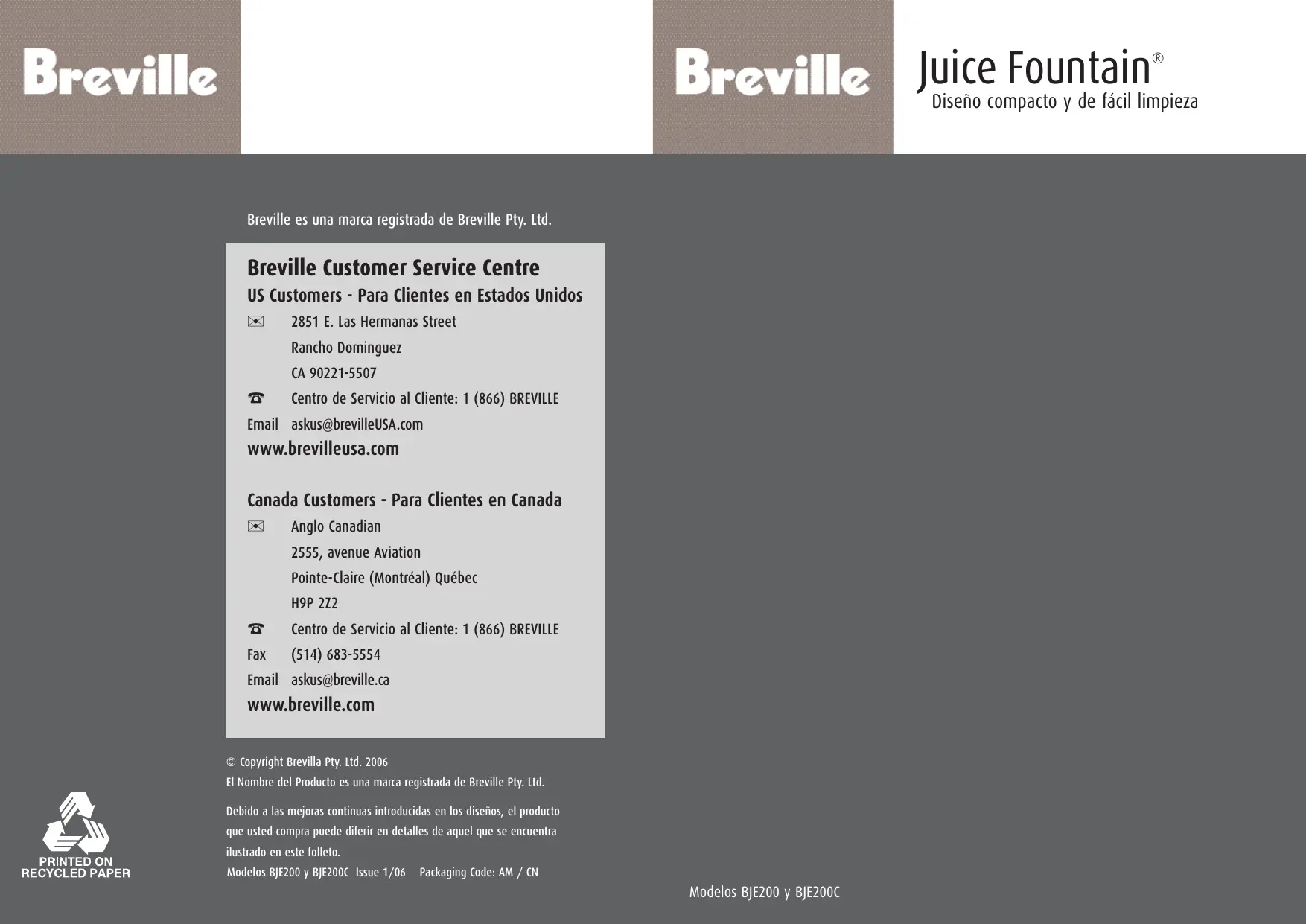 PRINTED ON RECYCLED PAPER Breville es una marca registrada de Breville Pty. Ltd. Breville Customer Service Centre US Customers - Para Clientes en Estados Unidos Dsq 2851 E. Las Hermanas Street Rancho Dominguez CA 90221-5507 Æ Centro de Servicio al Cliente: 1 (866) BREVILLE Email askus@brevilleUSA.com www.brevilleusa.com Canada Customers - Para Clientes en Canada +] Anglo Canadian 2555, avenue Aviation Pointe-Claire (Montréal) Québec H9P 272 Æ Centro de Servicio al Cliente: 1 (866) BREVILLE Fax (514) 683-5554 Email askus@breville.ca www.breville.com © Copyright Brevilla Pty. Ltd. 2006 El Nombre del Producto es una marca registrada de Breville Pty. Ltd. Debido a las mejores continuas introducidas en los diseños, el producto que usted compra puede diferir en detalles de aquel que se encuentra ilustrado en este folleto. Modelos 8JE200 y BJE200C Issue 1/06 Packaging Code: AM / CN Breville Modelos BJE200 y BJE200C Juice Fountain” Diseño compacto y de fâcil limpieza