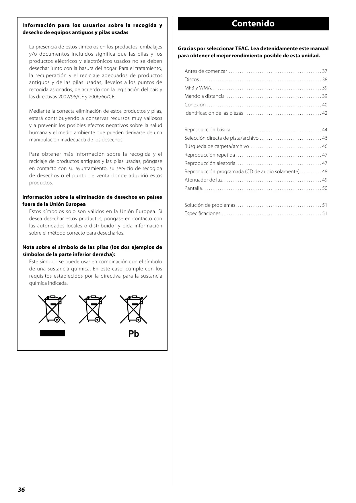 - Información para los usuarios sobre la recogida y desecho de equipos antiguos y pilas usadas La presencia de estos símbolos en los productos, embalajes y/o documentos incluidos significa que las pilas y los productos eléctricos y electrónicos usados no se deben desechar junto con la basura del hogar. Para el tratamiento, la recuperación y el reciclaje adecuados de productos antiguos y de las pilas usadas, llévelos a los puntos de recogida asignados, de acuerdo con la legislación del país y las directivas 2002/96/CE y 2006/66/CE. Contenido Gracias por seleccionar TEAC. Lea detenidamente este manual para obtener el mejor rendimiento posible de esta unidad. Antes de comenzar p. 37