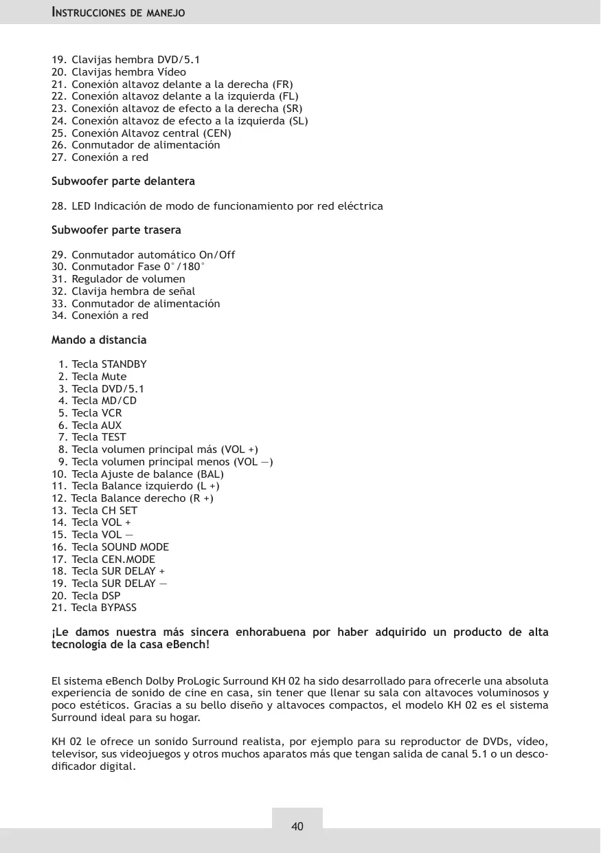 ¡Le damos nuestra más sincera enhorabuena por haber adquirido un producto de alta tecnología de la casa eBench! El sistema eBench Dolby ProLogic Surround KH 02 ha sido desarrollado para ofrecerle una absoluta experiencia de sonido de cine en casa, sin tener que llenar su sala con altavoces voluminosos y poco estéticos. Gracias a su bello diseño y altavoces compactos, el modelo KH 02 es el sistema Surround ideal para su hogar. KH 02 le ofrece un sonido Surround realista, por ejemplo para su reproductor de DVDs, vídeo, televisor, sus videojuegos y otros muchos aparatos más que tengan salida de canal 5.1 o un descodicador digital.