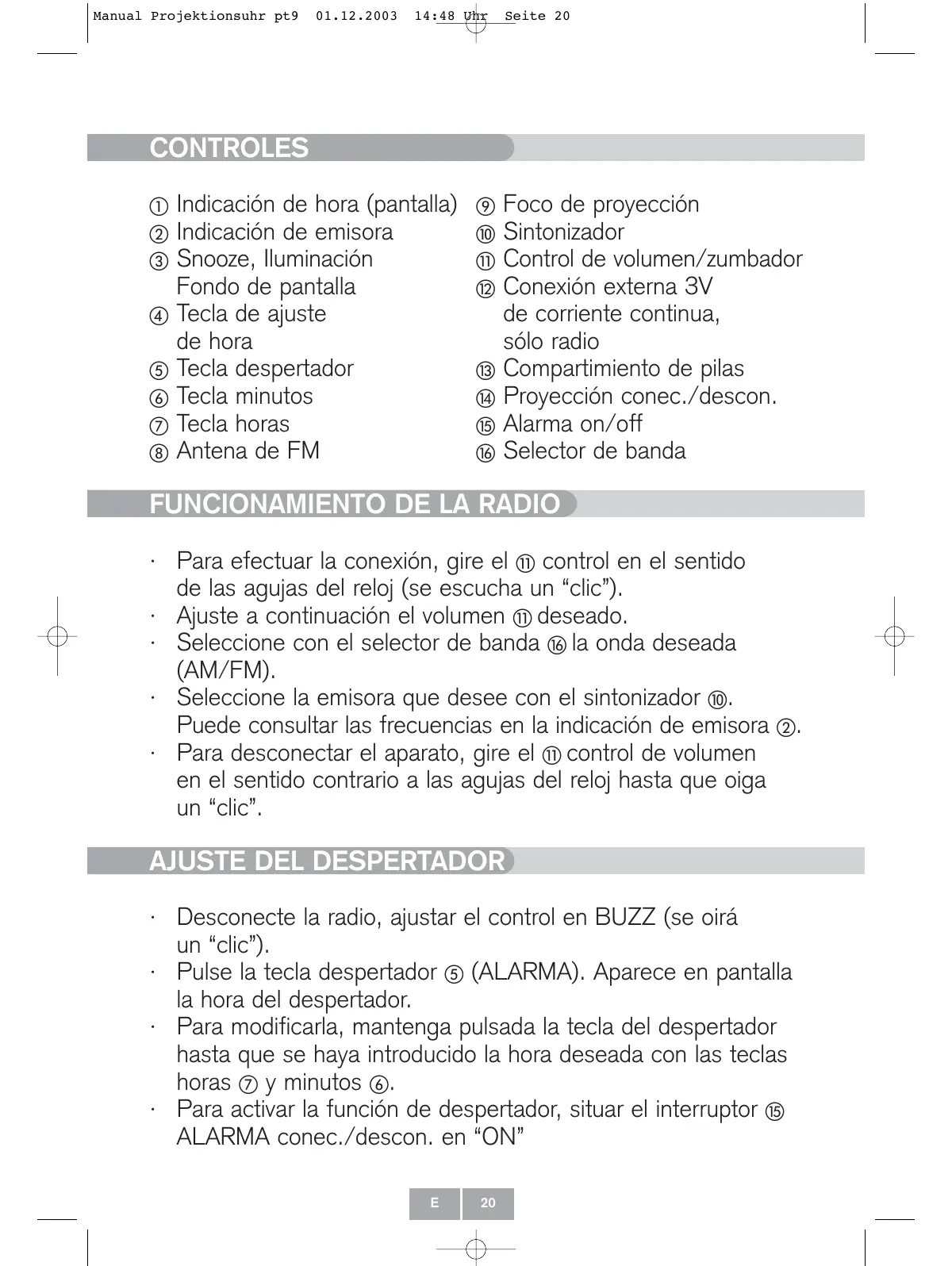 Al pugar la tecla SNOOZE ③ se interruppe el sonido del descentador durante 8关键时刻. Una vez transcurridos these 8 minutes, se vuelve a activar el sonido del descentador. Para desactivar Completely el descentador, situar el interruptor ⑤ ALARMA conec./descon. en “OFF”.