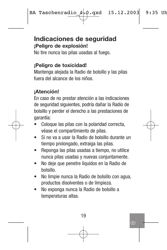 BA Taschenradio ro 15.12.2003 Indicaciones de seguridad iPeligro de explosién! No tire nunca las pilas usadas al fuego. iPeligro de toxicidad! Mantenga alejada la Radio de bolsillo y las pilas fuera del alcance de los niños. iAtencién! En caso de no prestar atenciôn a las indicaciones de seguridad siguientes, podria dañar la Radio de bolsill y perder el derecho a las prestaciones de garantia: + Coloque las pilas con la polaridad correcta, véase el compartimiento de pilas. + Si no va a usar la Radio de bolsillo durante un tiempo prolongado, extraiga las pilas. + Reponga las pilas usadas a tiempo, no utlice nunca pilas usadas y nuevas conjuntamente. + No deje que penetre liquidos en la Radio de bolsill. + No limpie nunca la Radio de bolsillo con agua, productos disolventes 0 de limpieza. + No exponga nunca la Radio de bolsillo a temperaturas altas.